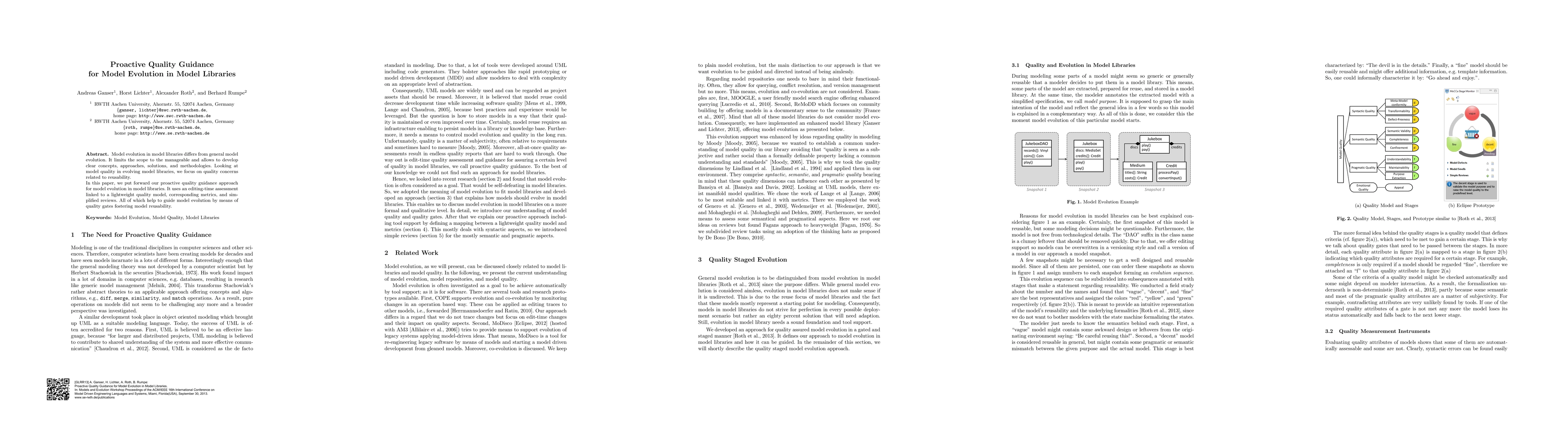 Model evolution in model libraries differs from general model evolution. It limits the scope to the manageable and allows to develop clear concepts, approaches, solutions, and methodologies. Looking at model quality in evolving model libraries, we focus on quality concerns related to reusability. In this paper, we put forward our proactive quality guidance approach for model evolution in model libraries. It uses an editing-time assessment linked to a lightweight quality model, corresponding metrics, and simplified reviews. All of which help to guide model evolution by means of quality gates fostering model reusability.