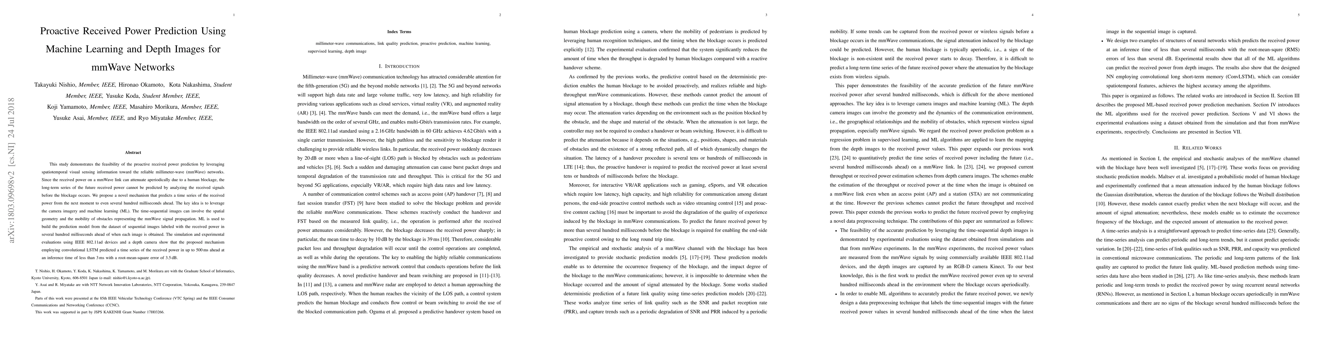 This study proposes a machine learning-based mechanism using depth images to predict received power in mmWave networks, addressing the issue of aperiodic attenuation due to human blockage. The convolutional LSTM model trained on spatiotemporal visual data achieved accurate predictions up to 500 ms ahead with a low inference time and RMSE of 3.5 dB.
