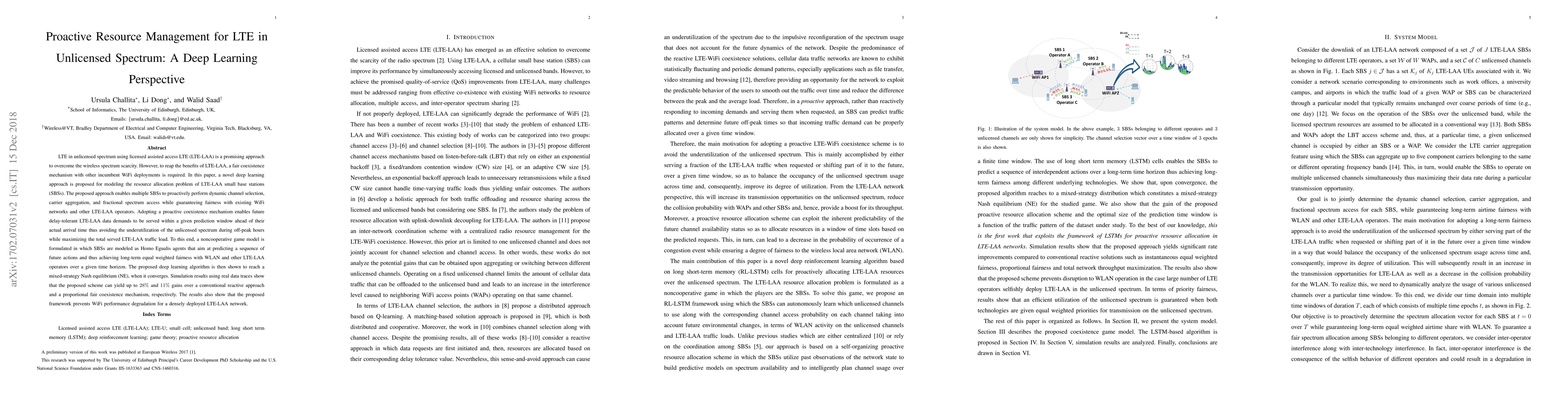 This paper proposes a deep learning approach for proactive resource management in LTE-LAA networks operating in unlicensed spectrum, focusing on dynamic channel selection and carrier aggregation. The proactive coexistence mechanism ensures fair LTE-LAA traffic load maximization while preventing WiFi performance degradation, achieving up to 28% improvement over conventional methods.