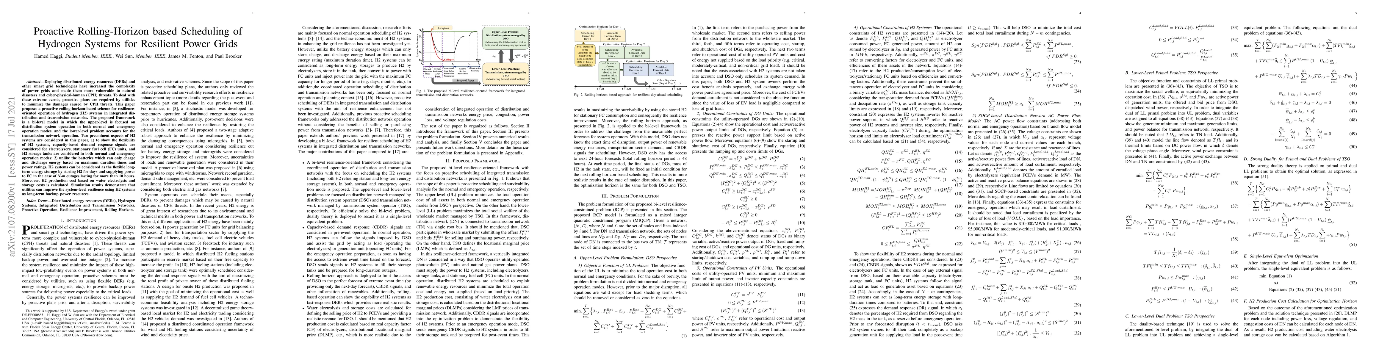 This paper proposes a proactive rolling-horizon-based scheduling framework for hydrogen systems to enhance the resilience of power grids against natural disasters and cyber threats. The bi-level model optimizes hydrogen systems for both distribution and transmission networks, highlighting their flexibility and long-term storage capabilities to provide backup power during extended outages.