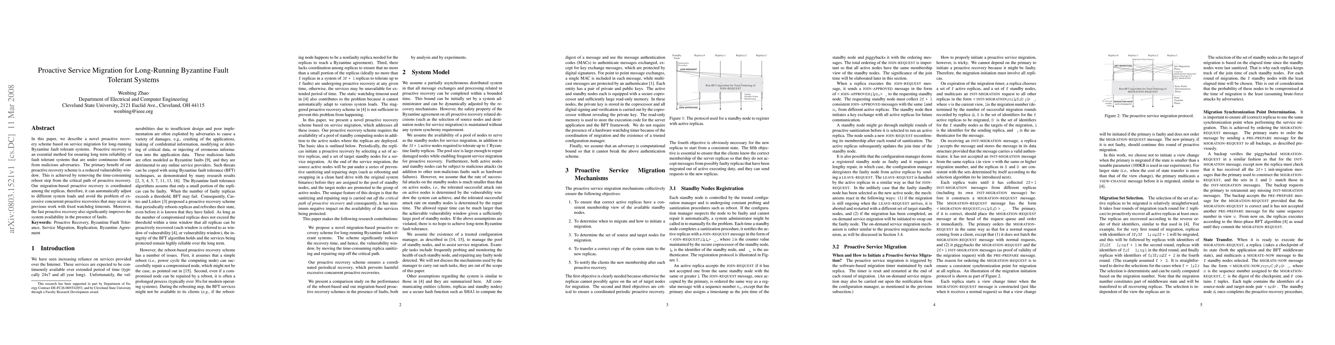 This paper introduces a proactive service migration scheme for Byzantine fault tolerant systems, aiming to reduce vulnerability windows by eliminating reboots and coordinating migrations among replicas to adjust to varying system loads, thereby enhancing system availability.