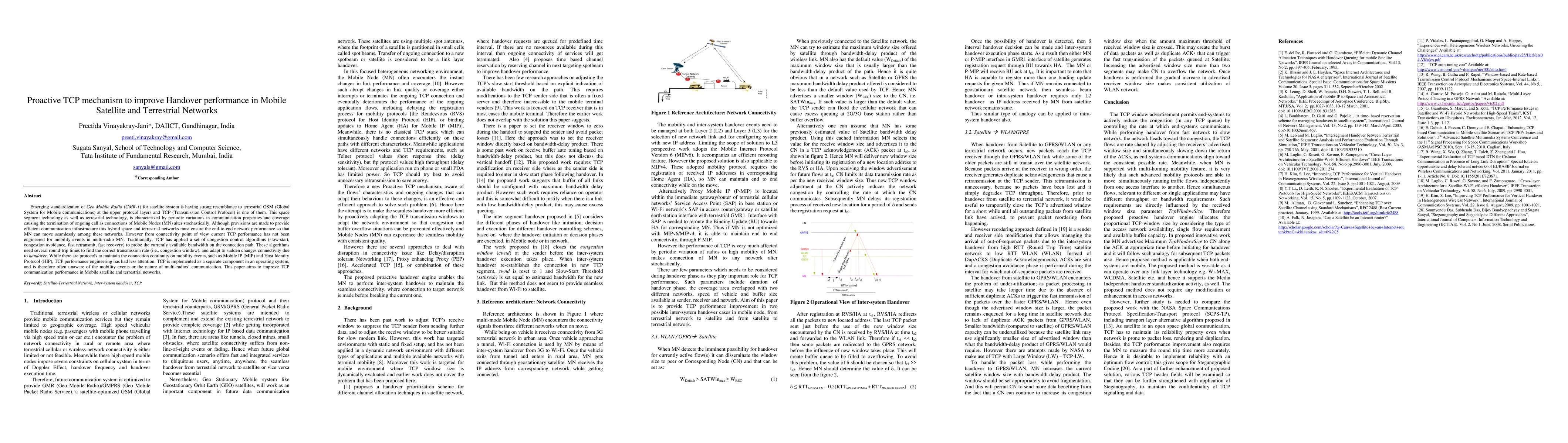 Emerging standardization of Geo Mobile Radio (GMR-1) for satellite system is having strong resemblance to terrestrial GSM (Global System for Mobile communications) at the upper protocol layers and TCP (Transmission Control Protocol) is one of them. This space segment technology as well as terrestrial technology, is characterized by periodic variations in communication properties and coverage causing the termination of ongoing call as connections of Mobile Nodes (MN) alter stochastically. Although provisions are made to provide efficient communication infrastructure this hybrid space and terrestrial networks must ensure the end-to-end network performance so that MN can move seamlessly among these networks. However from connectivity point of view current TCP performance has not been engineered for mobility events in multi-radio MN. Traditionally, TCP has applied a set of congestion control algorithms (slow-start, congestion avoidance, fast retransmit, fast recovery) to probe the currently available bandwidth on the connection path. These algorithms need several round-trip times to find the correct transmission rate (i.e. congestion window), and adapt to sudden changes connectivity due to handover. While there are protocols to maintain the connection continuity on mobility events, such as Mobile IP (MIP) and Host Identity Protocol (HIP), TCP performance engineering has had less attention. TCP is implemented as a separate component in an operating system, and is therefore often unaware of the mobility events or the nature of multi-radios' communication. This paper aims to improve TCP communication performance in Mobile satellite and terrestrial networks.