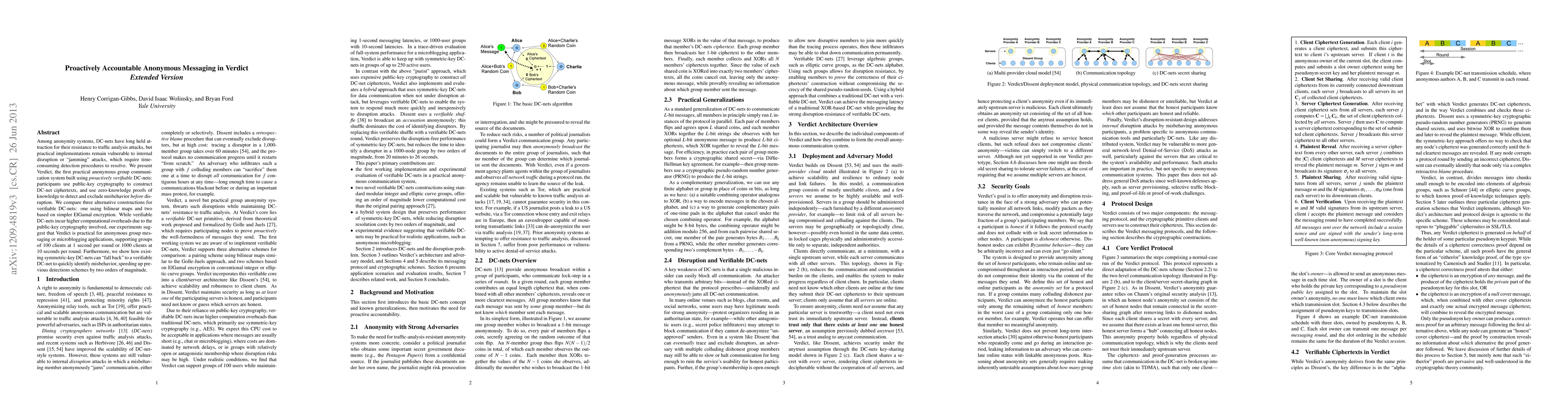Verdict is a practical anonymous group communication system that leverages proactively verifiable DC-nets to detect and exclude misbehavior before disruptions occur, using public key cryptography and knowledge proofs. The system supports groups of up to 1000 clients and improves misbehavior detection by two orders of magnitude compared to previous schemes.