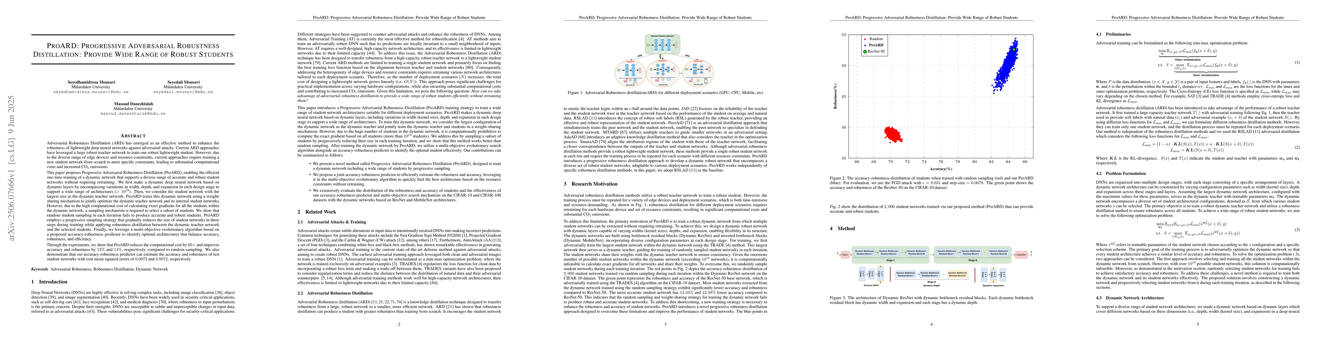 Adversarial Robustness Distillation (ARD) has emerged as an effective method to enhance the robustness of lightweight deep neural networks against adversarial attacks. Current ARD approaches have leveraged a large robust teacher network to train one robust lightweight student. However, due to the diverse range of edge devices and resource constraints, current approaches require training a new student network from scratch to meet specific constraints, leading to substantial computational costs and increased CO2 emissions. This paper proposes Progressive Adversarial Robustness Distillation (ProARD), enabling the efficient one-time training of a dynamic network that supports a diverse range of accurate and robust student networks without requiring retraining. We first make a dynamic deep neural network based on dynamic layers by encompassing variations in width, depth, and expansion in each design stage to support a wide range of architectures. Then, we consider the student network with the largest size as the dynamic teacher network. ProARD trains this dynamic network using a weight-sharing mechanism to jointly optimize the dynamic teacher network and its internal student networks. However, due to the high computational cost of calculating exact gradients for all the students within the dynamic network, a sampling mechanism is required to select a subset of students. We show that random student sampling in each iteration fails to produce accurate and robust students.