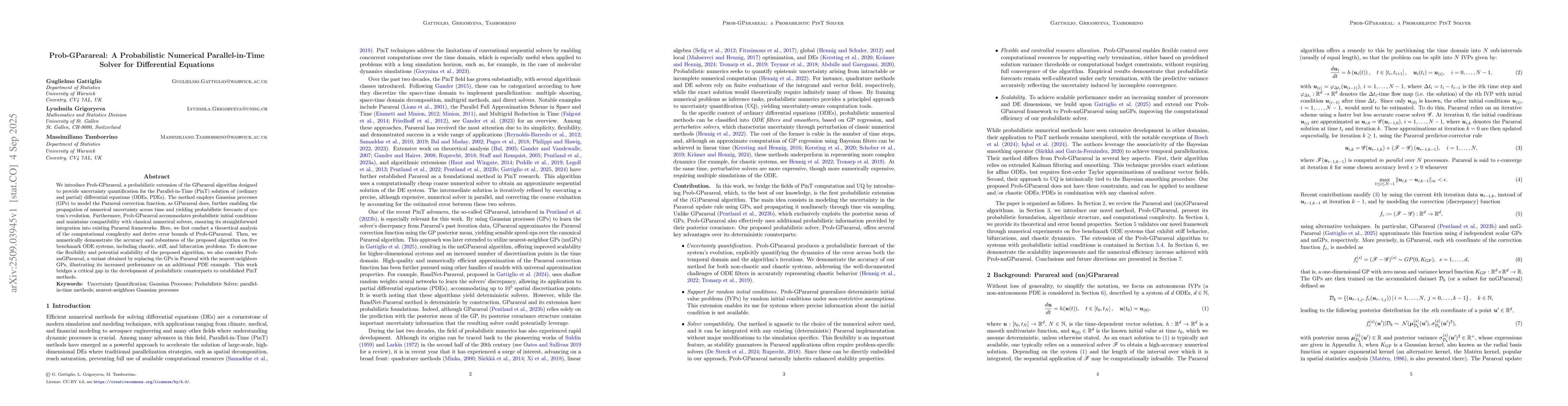 We introduce Prob-GParareal, a probabilistic extension of the GParareal algorithm designed to provide uncertainty quantification for the Parallel-in-Time (PinT) solution of (ordinary and partial) differential equations (ODEs, PDEs). The method employs Gaussian processes (GPs) to model the Parareal correction function, as GParareal does, further enabling the propagation of numerical uncertainty across time and yielding probabilistic forecasts of system's evolution. Furthermore, Prob-GParareal accommodates probabilistic initial conditions and maintains compatibility with classical numerical solvers, ensuring its straightforward integration into existing Parareal frameworks. Here, we first conduct a theoretical analysis of the computational complexity and derive error bounds of Prob-GParareal. Then, we numerically demonstrate the accuracy and robustness of the proposed algorithm on five benchmark ODE systems, including chaotic, stiff, and bifurcation problems. To showcase the flexibility and potential scalability of the proposed algorithm, we also consider Prob-nnGParareal, a variant obtained by replacing the GPs in Parareal with the nearest-neighbors GPs, illustrating its increased performance on an additional PDE example. This work bridges a critical gap in the development of probabilistic counterparts to established PinT methods.