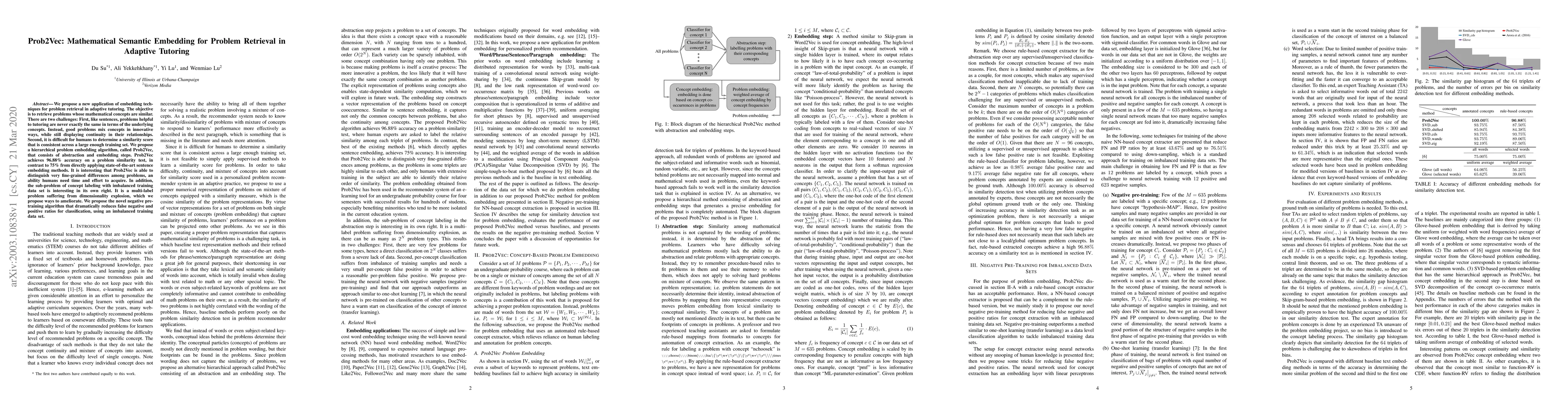 Researchers developed Prob2Vec, a new algorithm for problem retrieval in adaptive tutoring that achieves 96.88% accuracy, outperforming existing sentence embedding methods. The approach tackles challenges of concept similarity and labeling with imbalanced training data.
