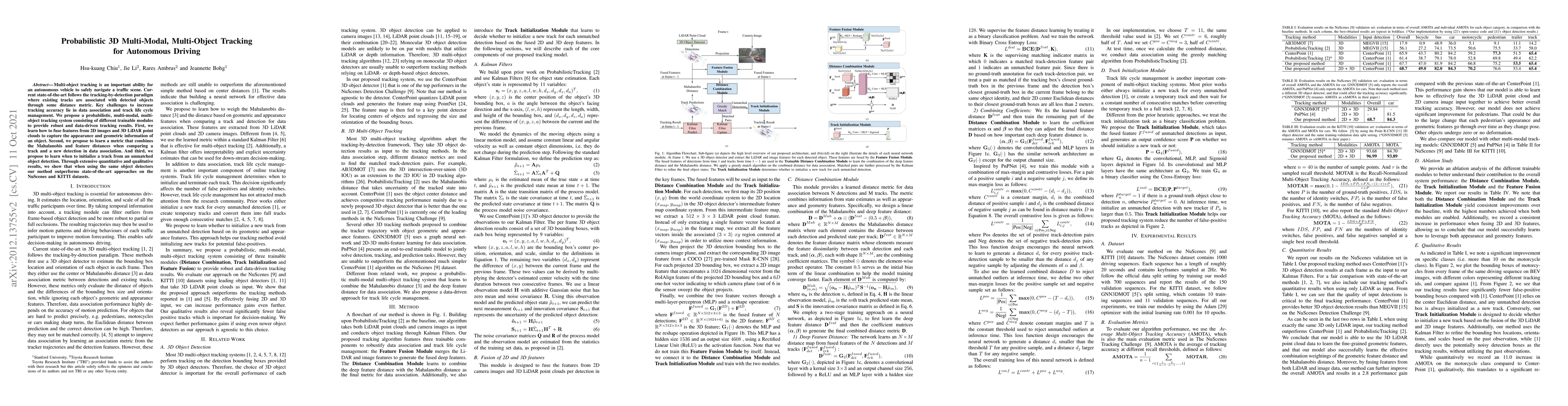 This research presents a probabilistic multi-modal, multi-object tracking system for autonomous driving that fuses 2D image and 3D LiDAR features, employs a learned metric for data association, and determines optimal track initialization, outperforming current state-of-the-art methods on NuScenes and KITTI datasets.