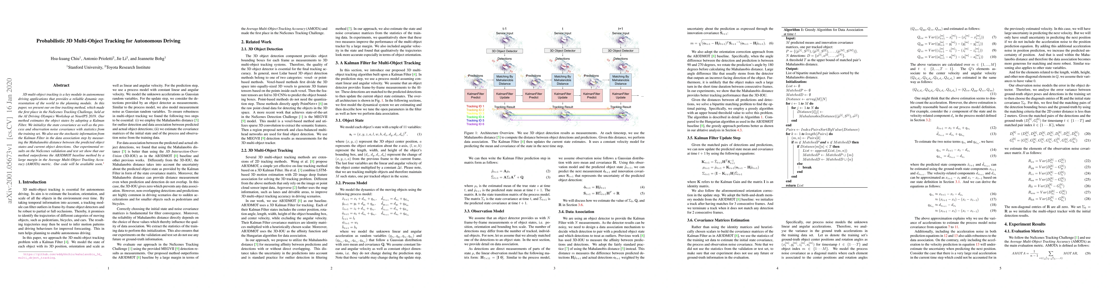 This paper introduces an on-line tracking method for 3D multi-object tracking in autonomous driving, winning the NuScenes Tracking Challenge. It uses a Kalman Filter to estimate object states and outperforms the AB3DMOT baseline significantly in Average Multi-Object Tracking Accuracy (AMOTA).