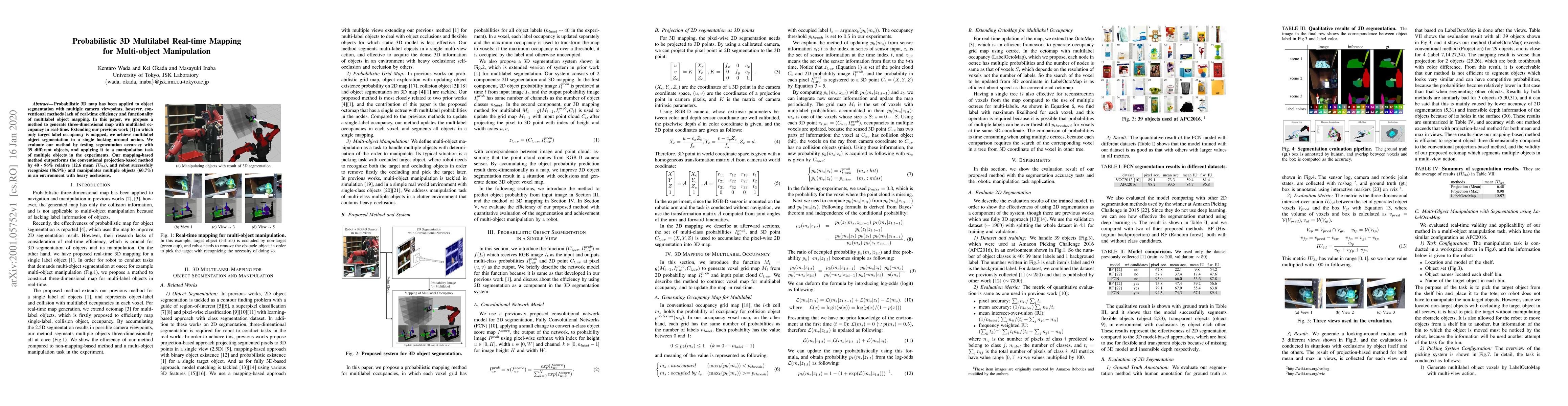 Probabilistic 3D map has been applied to object segmentation with multiple camera viewpoints, however, conventional methods lack of real-time efficiency and functionality of multilabel object mapping. In this paper, we propose a method to generate three-dimensional map with multilabel occupancy in real-time. Extending our previous work in which only target label occupancy is mapped, we achieve multilabel object segmentation in a single looking around action. We evaluate our method by testing segmentation accuracy with 39 different objects, and applying it to a manipulation task of multiple objects in the experiments. Our mapping-based method outperforms the conventional projection-based method by 40 - 96\% relative (12.6 mean $IU_{3d}$), and robot successfully recognizes (86.9\%) and manipulates multiple objects (60.7\%) in an environment with heavy occlusions.