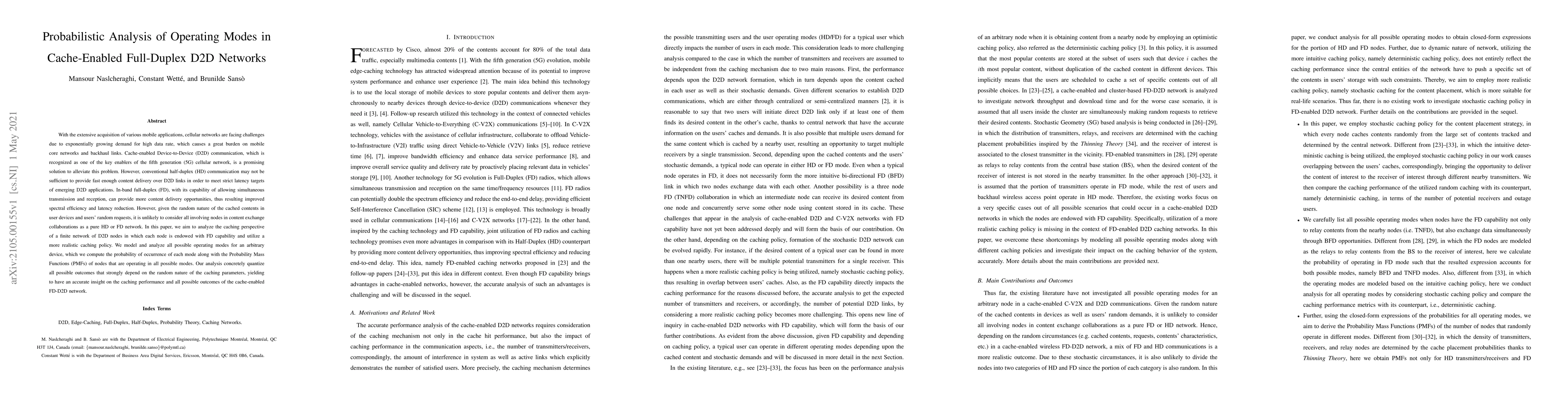 This paper analyzes the probabilistic operating modes in cache-enabled full-duplex D2D networks, focusing on the impact of caching policies on spectral efficiency and latency. It models and computes the probabilities of different operating modes, providing insights into the network's performance under random caching conditions.