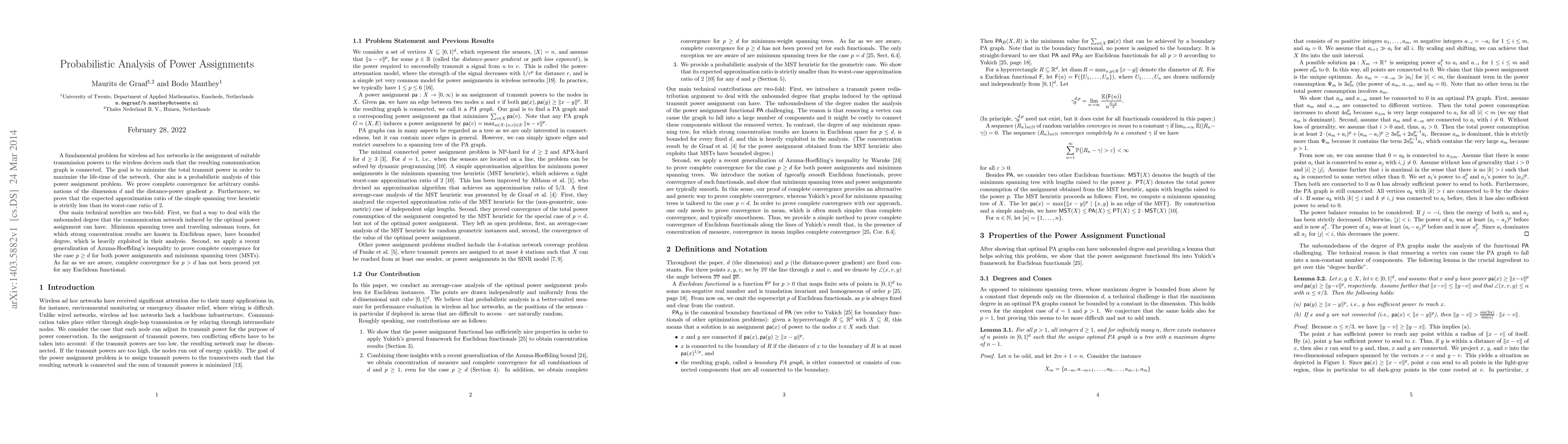 This paper conducts a probabilistic analysis of power assignment in wireless ad hoc networks to ensure network connectivity while minimizing total transmit power. It proves complete convergence for various dimensions and distance-power gradients and demonstrates that the expected approximation ratio of a simple spanning tree heuristic is strictly less than its worst-case ratio of 2.