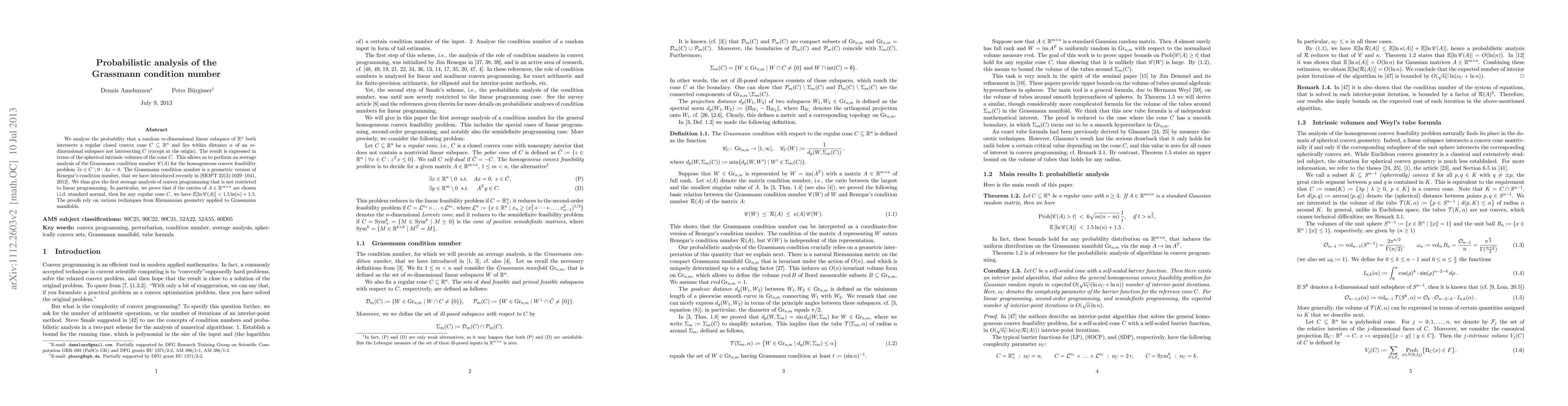We analyze the probability that a random m-dimensional linear subspace of R^n both intersects a regular closed convex cone C\subseteq R^n and lies within distance \alpha of an m-dimensional subspace not intersecting C (except at the origin). The result is expressed in terms of the spherical intrinsic volumes of the cone C. This allows us to perform an average analysis of the Grassmann condition number \C(A) for the homogeneous convex feasibility problem \exists x\in C\setminus 0 : Ax=0. The Grassmann condition number is a geometric version of Renegar's condition number, that we have introduced recently in [SIOPT 22(3):1029-1041, 2012]. We thus give the first average analysis of convex programming that is not restricted to linear programming. In particular, we prove that if the entries of A\in R^{m\times n} are chosen i.i.d. standard normal, then for any regular cone C, we have E[ln\C(A)]<1.5 ln(n)+1.5. The proofs rely on various techniques from Riemannian geometry applied to Grassmann manifolds.