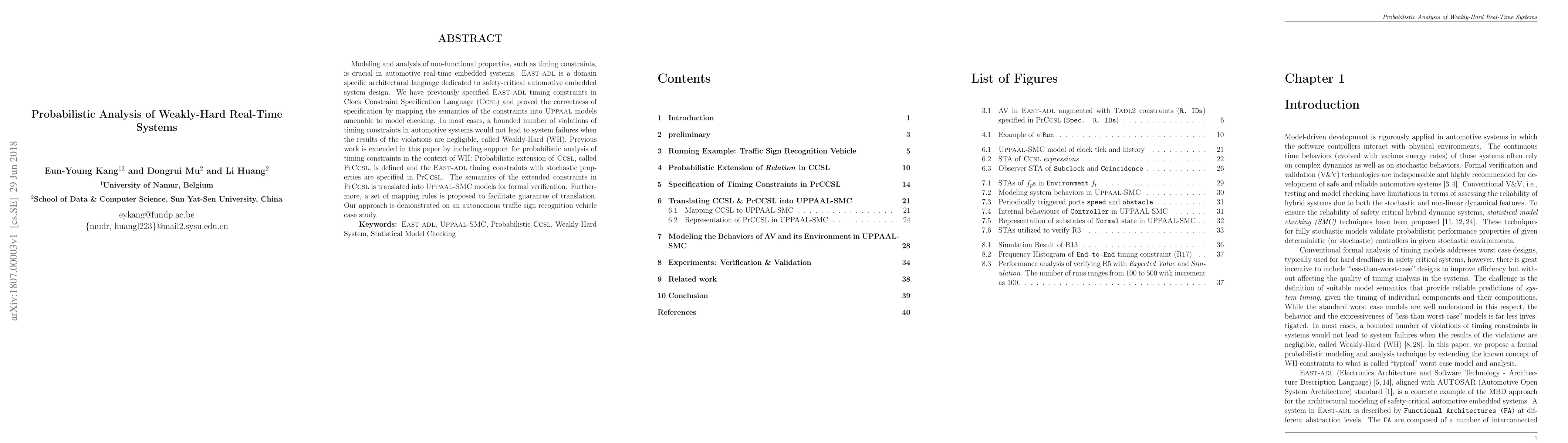 This paper extends previous work on EAST-ADL and timing constraints in automotive systems by introducing a probabilistic extension of the Clock Constraint Specification Language (PrCCSL) to analyze Weakly-Hard real-time systems. The approach is demonstrated through formal verification using Uppaal-SMC models, validated via a case study on an autonomous traffic sign recognition vehicle.