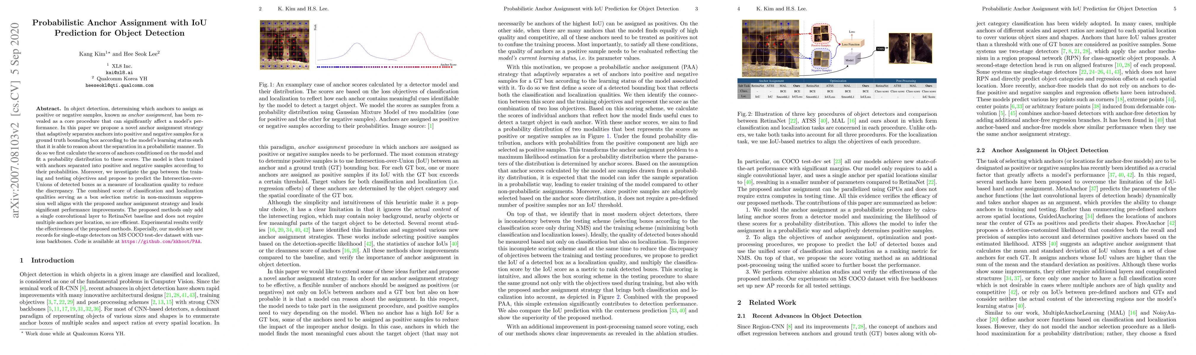 In object detection, determining which anchors to assign as positive or negative samples, known as anchor assignment, has been revealed as a core procedure that can significantly affect a model's performance. In this paper we propose a novel anchor assignment strategy that adaptively separates anchors into positive and negative samples for a ground truth bounding box according to the model's learning status such that it is able to reason about the separation in a probabilistic manner. To do so we first calculate the scores of anchors conditioned on the model and fit a probability distribution to these scores. The model is then trained with anchors separated into positive and negative samples according to their probabilities. Moreover, we investigate the gap between the training and testing objectives and propose to predict the Intersection-over-Unions of detected boxes as a measure of localization quality to reduce the discrepancy. The combined score of classification and localization qualities serving as a box selection metric in non-maximum suppression well aligns with the proposed anchor assignment strategy and leads significant performance improvements. The proposed methods only add a single convolutional layer to RetinaNet baseline and does not require multiple anchors per location, so are efficient. Experimental results verify the effectiveness of the proposed methods. Especially, our models set new records for single-stage detectors on MS COCO test-dev dataset with various backbones. Code is available at https://github.com/kkhoot/PAA.