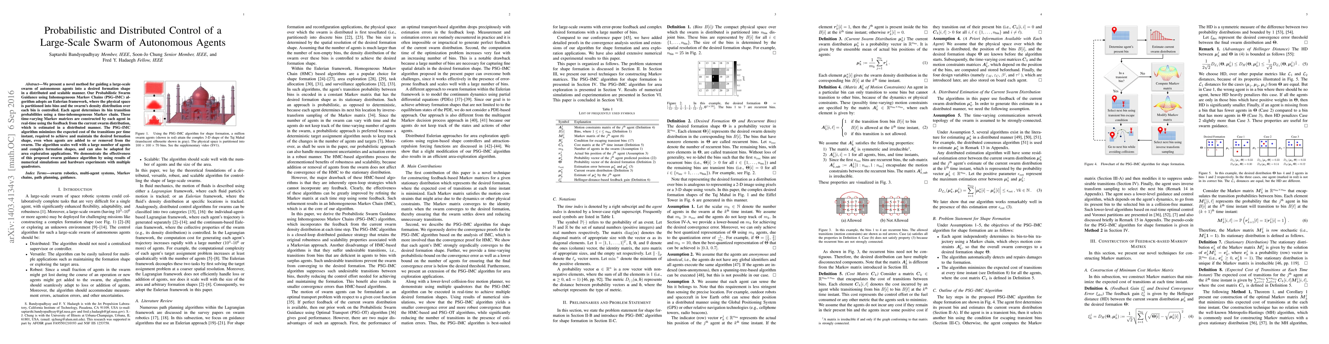 This paper introduces a Probabilistic Swarm Guidance using Inhomogeneous Markov Chains (PSG-IMC) algorithm for controlling large-scale swarms of autonomous agents to achieve desired formation shapes. The method scales well and adapts to dynamic changes in the swarm size, demonstrated through simulations and quadrotor experiments.