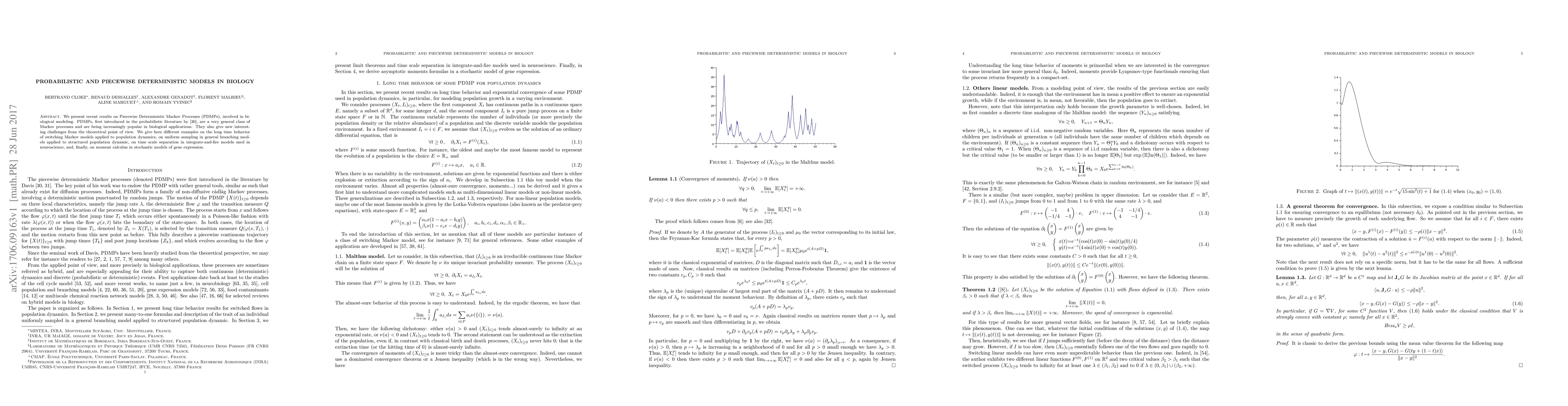 We present recent results on Piecewise Deterministic Markov Processes (PDMPs), involved in biological modeling. PDMPs, first introduced in the probabilistic literature by Davis (1984), are a very general class of Markov processes and are being increasingly popular in biological applications. They also give new interesting challenges from the theoretical point of view. We give here different examples on the long time behavior of switching Markov models applied to population dynamics, on uniform sampling in general branching models applied to structured population dynamic, on time scale separation in integrate-and-fire models used in neuroscience, and, finally, on moment calculus in stochastic models of gene expression.