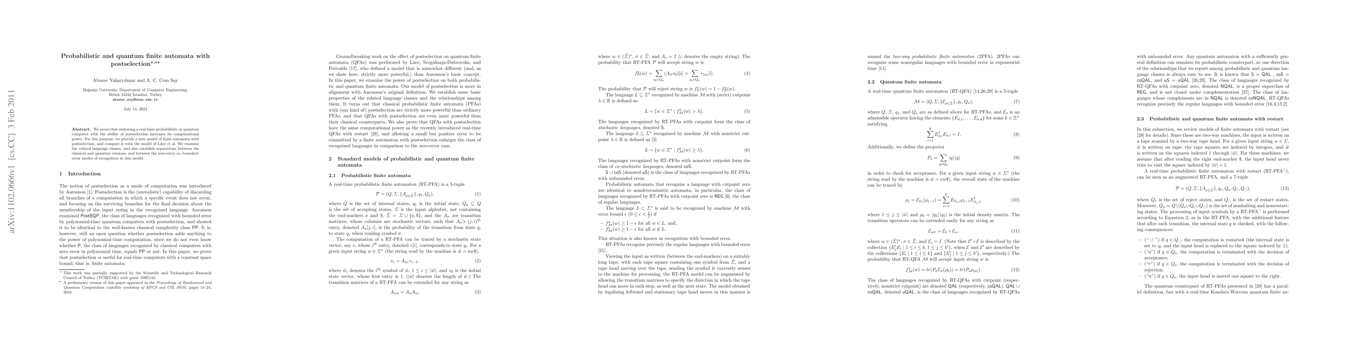 Researchers prove that adding postselection to probabilistic and quantum finite automata significantly increases their computational power, with implications for language recognition and error correction capabilities.