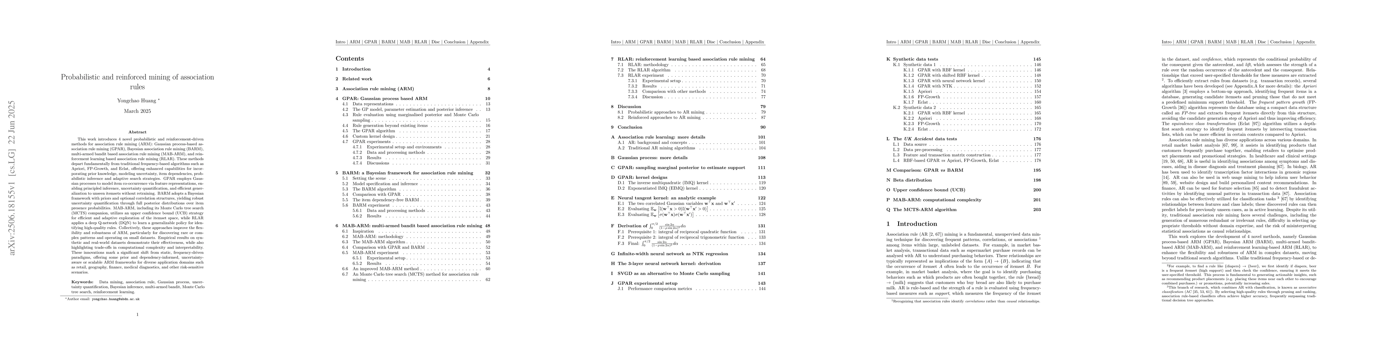 This work introduces 4 novel probabilistic and reinforcement-driven methods for association rule mining (ARM): Gaussian process-based association rule mining (GPAR), Bayesian ARM (BARM), multi-armed bandit based ARM (MAB-ARM), and reinforcement learning based association rule mining (RLAR). These methods depart fundamentally from traditional frequency-based algorithms such as Apriori, FP-Growth, and Eclat, offering enhanced capabilities for incorporating prior knowledge, modeling uncertainty, item dependencies, probabilistic inference and adaptive search strategies. GPAR employs Gaussian processes to model item co-occurrence via feature representations, enabling principled inference, uncertainty quantification, and efficient generalization to unseen itemsets without retraining. BARM adopts a Bayesian framework with priors and optional correlation structures, yielding robust uncertainty quantification through full posterior distributions over item presence probabilities. MAB-ARM, including its Monte Carlo tree search (MCTS) companion, utilizes an upper confidence bound (UCB) strategy for efficient and adaptive exploration of the itemset space, while RLAR applies a deep Q-network (DQN) to learn a generalizable policy for identifying high-quality rules. Collectively, these approaches improve the flexibility and robustness of ARM, particularly for discovering rare or complex patterns and operating on small datasets. Empirical results on synthetic and real-world datasets demonstrate their effectiveness, while also highlighting trade-offs in computational complexity and interpretability. These innovations mark a significant shift from static, frequency-driven paradigms, offering some prior and dependency-informed, uncertainty-aware or scalable ARM frameworks for diverse application domains such as retail, geography, finance, medical diagnostics, and risk-sensitive scenarios.