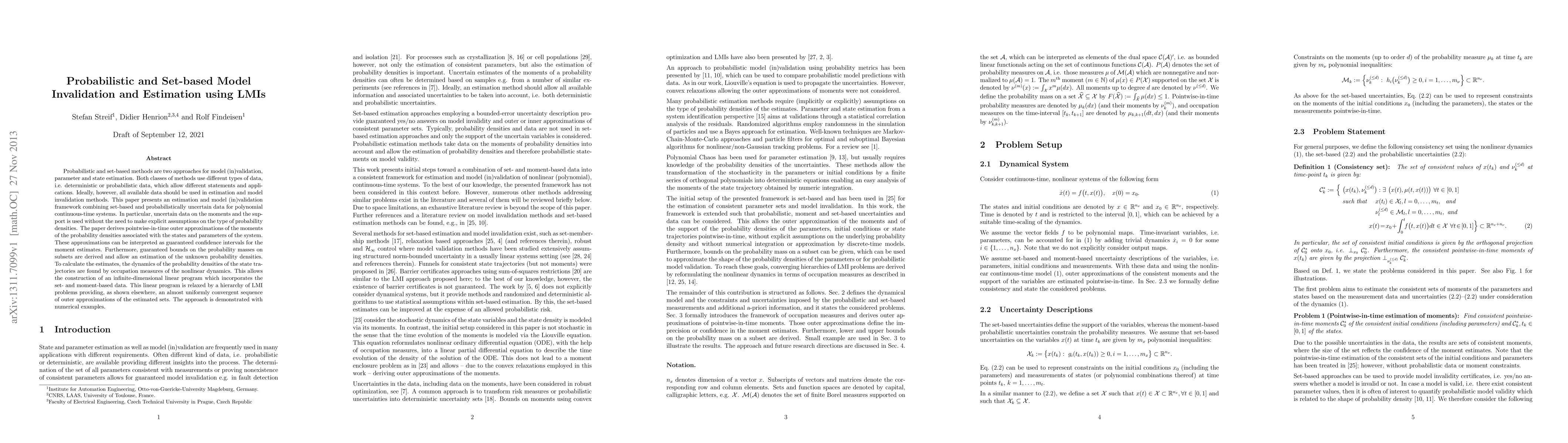 A new framework combines set-based and probabilistic methods for model invalidation and estimation in polynomial continuous-time systems, providing guaranteed confidence intervals and bounds on probability masses using linear programming and LMI problems.