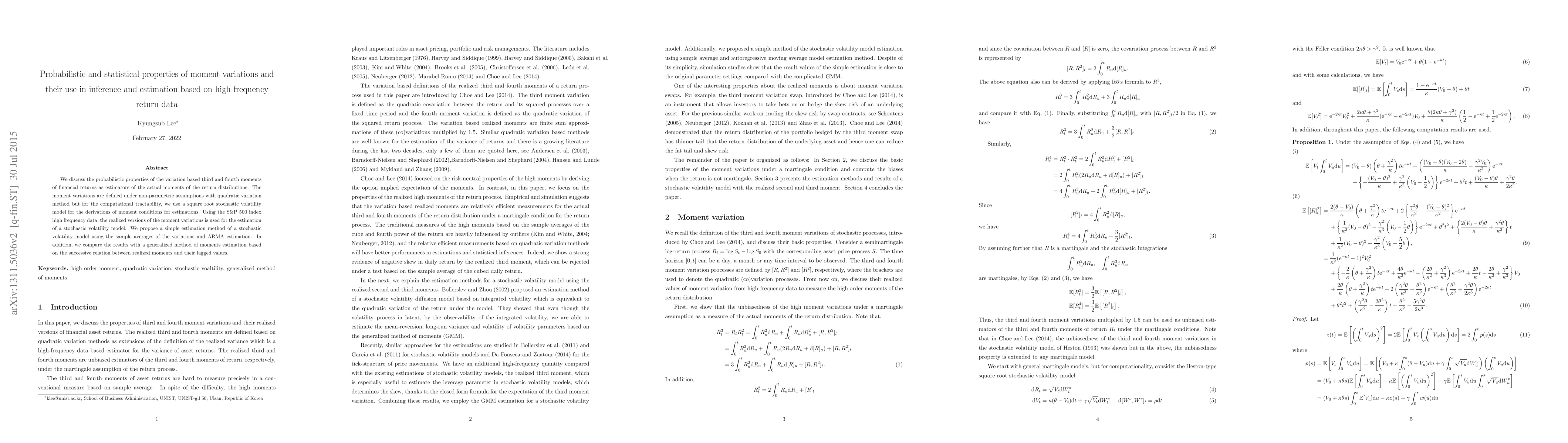 We discuss the probabilistic properties of the variation based third and fourth moments of financial returns as estimators of the actual moments of the return distributions. The moment variations are defined under non-parametric assumptions with quadratic variation method but for the computational tractability, we use a square root stochastic volatility model for the derivations of moment conditions for estimations. Using the S\&P 500 index high frequency data, the realized versions of the moment variations is used for the estimation of a stochastic volatility model. We propose a simple estimation method of a stochastic volatility model using the sample averages of the variations and ARMA estimation. In addition, we compare the results with a generalized method of moments estimation based on the successive relation between realized moments and their lagged values.