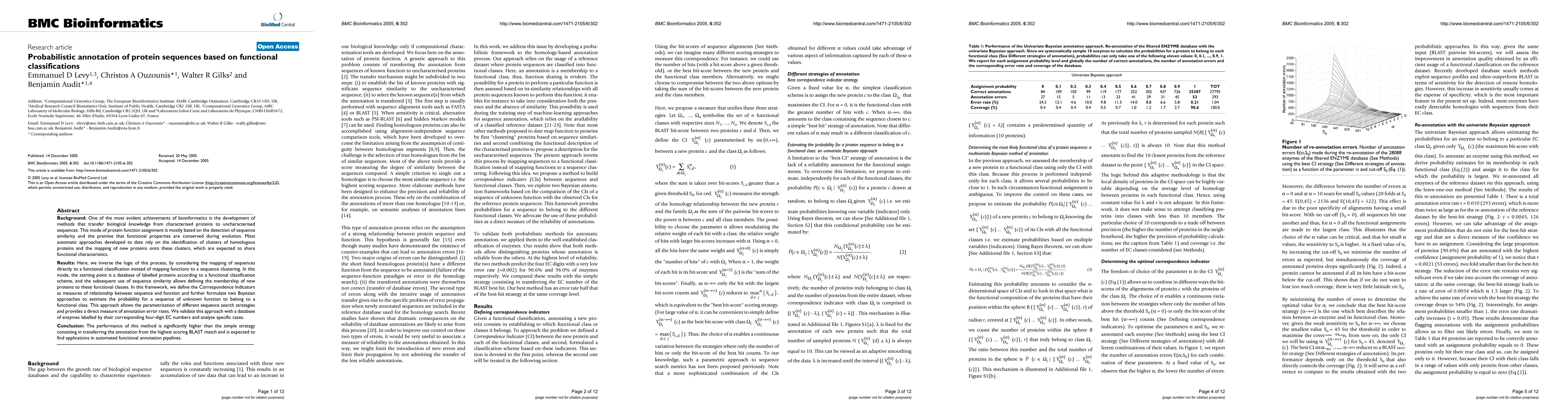 BACKGROUND: One of the most evident achievements of bioinformatics is the development of methods that transfer biological knowledge from characterised proteins to uncharacterised sequences. This mode of protein function assignment is mostly based on the detection of sequence similarity and the premise that functional properties are conserved during evolution. Most automatic approaches developed to date rely on the identification of clusters of homologous proteins and the mapping of new proteins onto these clusters, which are expected to share functional characteristics. RESULTS: Here, we inverse the logic of this process, by considering the mapping of sequences directly to a functional classification instead of mapping functions to a sequence clustering. In this mode, the starting point is a database of labelled proteins according to a functional classification scheme, and the subsequent use of sequence similarity allows defining the membership of new proteins to these functional classes. In this framework, we define the Correspondence Indicators as measures of relationship between sequence and function and further formulate two Bayesian approaches to estimate the probability for a sequence of unknown function to belong to a functional class. This approach allows the parametrisation of different sequence search strategies and provides a direct measure of annotation error rates. We validate this approach with a database of enzymes labelled by their corresponding four-digit EC numbers and analyse specific cases. CONCLUSION: The performance of this method is significantly higher than the simple strategy consisting in transferring the annotation from the highest scoring BLAST match and is expected to find applications in automated functional annotation pipelines.