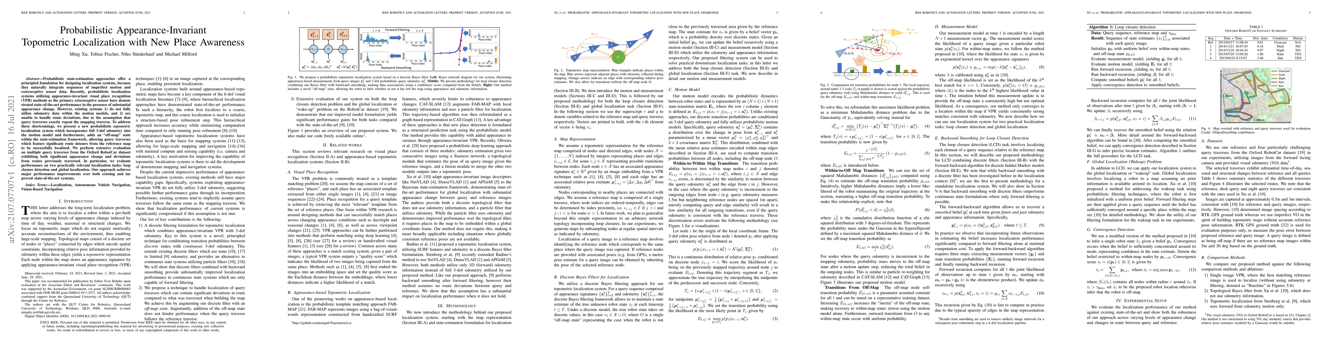 Probabilistic state-estimation approaches offer a principled foundation for designing localization systems, because they naturally integrate sequences of imperfect motion and exteroceptive sensor data. Recently, probabilistic localization systems utilizing appearance-invariant visual place recognition (VPR) methods as the primary exteroceptive sensor have demonstrated state-of-the-art performance in the presence of substantial appearance change. However, existing systems 1) do not fully utilize odometry data within the motion models, and 2) are unable to handle route deviations, due to the assumption that query traverses exactly repeat the mapping traverse. To address these shortcomings, we present a new probabilistic topometric localization system which incorporates full 3-dof odometry into the motion model and furthermore, adds an "off-map" state within the state-estimation framework, allowing query traverses which feature significant route detours from the reference map to be successfully localized. We perform extensive evaluation on multiple query traverses from the Oxford RobotCar dataset exhibiting both significant appearance change and deviations from routes previously traversed. In particular, we evaluate performance on two practically relevant localization tasks: loop closure detection and global localization. Our approach achieves major performance improvements over both existing and improved state-of-the-art systems.