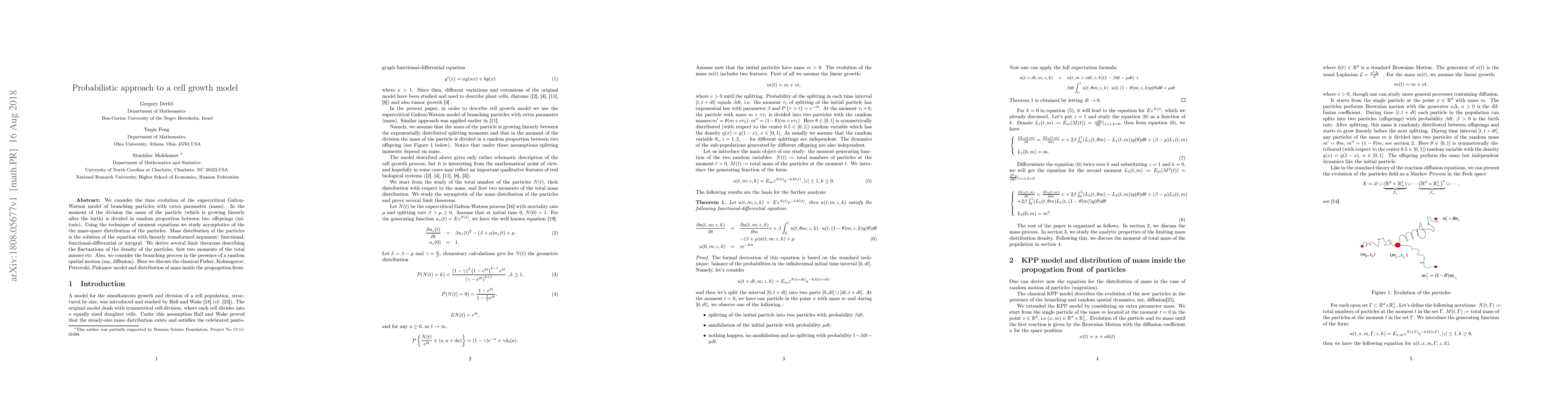We consider the time evolution of the supercritical Galton-Watson model of branching particles with extra parameter (mass). In the moment of the division the mass of the particle (which is growing linearly after the birth) is divided in random proportion between two offsprings (mitosis). Using the technique of moment equations we study asymptotic of the mass distribution of the particles. Mass distribution of the particles is the solution of the equation with linearly transformed argument: functional, functional-differential or integral. We derive several limit theorems describing the fluctuations of the density of the particles, first two moments of the total masses etc.