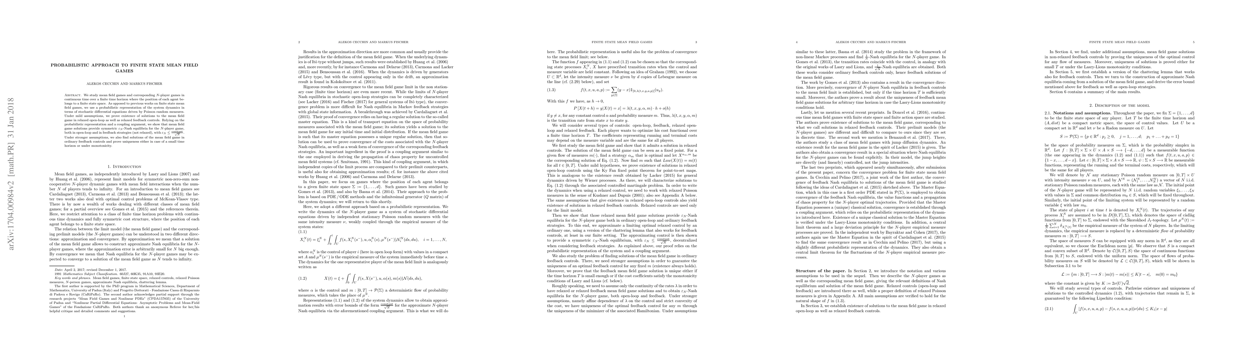 This paper explores finite state mean field games using probabilistic methods via stochastic differential equations driven by Poisson random measures. It proves the existence of solutions under relaxed controls and shows that mean field game solutions yield $\epsilon_N$-Nash equilibria for $N$-player games, with $\epsilon_N$ scaling inversely with the square root of $N$.