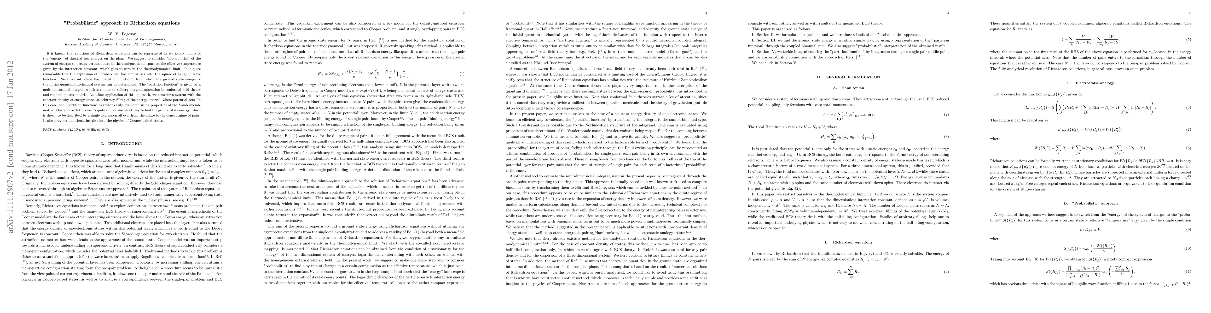 It is known that solutions of Richardson equations can be represented as stationary points of the "energy" of classical free charges on the plane. We suggest to consider "probabilities" of the system of charges to occupy certain states in the configurational space at the effective temperature given by the interaction constant, which goes to zero in the thermodynamical limit. It is quite remarkable that the expression of "probability" has similarities with the square of Laughlin wave function. Next, we introduce the "partition function", from which the ground state energy of the initial quantum-mechanical system can be determined. The "partition function" is given by a multidimensional integral, which is similar to Selberg integrals appearing in conformal field theory and random-matrix models. As a first application of this approach, we consider a system with the constant density of energy states at arbitrary filling of the energy interval, where potential acts. In this case, the "partition function" is rather easily evaluated using properties of the Vandermonde matrix. Our approach thus yields quite simple and short way to find the ground state energy, which is shown to be described by a single expression all over from the dilute to the dense regime of pairs. It also provides additional insights into the physics of Cooper-paired states.