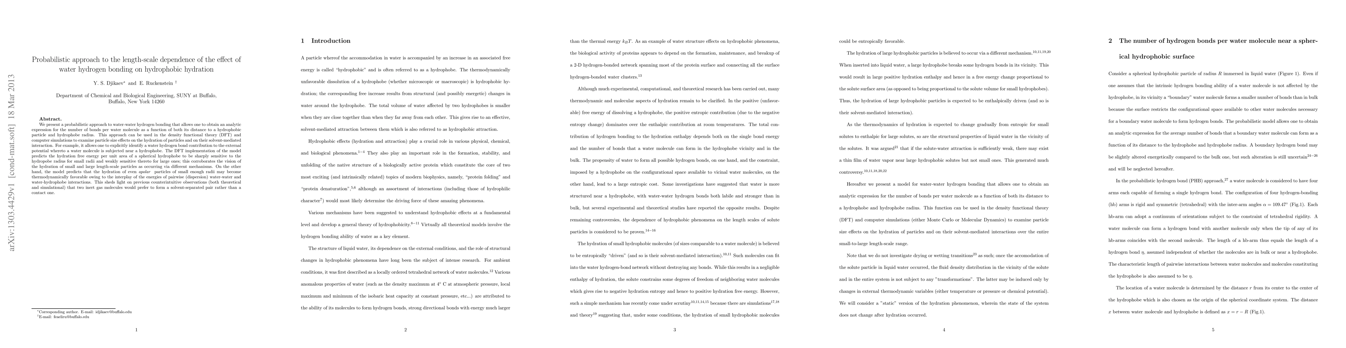 This paper introduces a probabilistic model for water-water hydrogen bonding that provides an analytic expression for the number of bonds per water molecule, influenced by distance to a hydrophobic particle and particle radius. The model's DFT implementation reveals distinct hydration mechanisms for small versus large hydrophobic particles and suggests that small apolar particles can become thermodynamically favorable due to dispersion interactions.