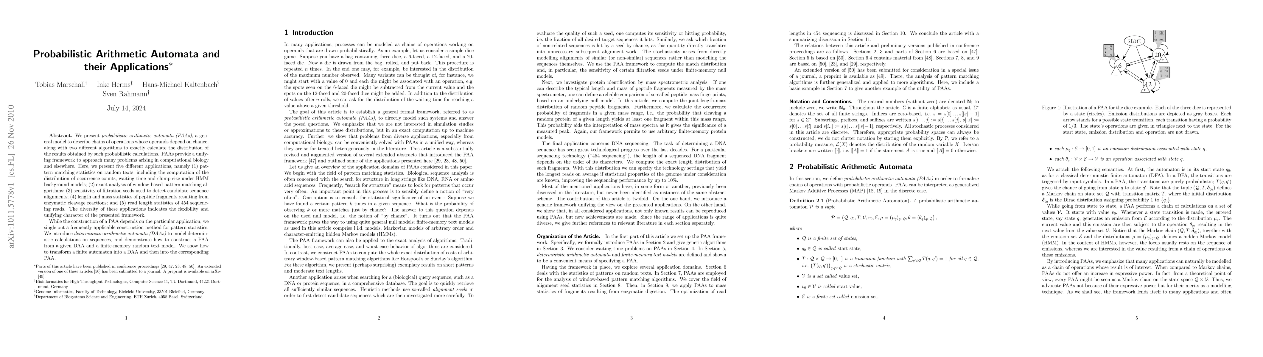 This paper introduces probabilistic arithmetic automata (PAAs) to model operations with chance-dependent operands and provides algorithms for calculating the exact distribution of results. It demonstrates PAA applications across computational biology, including pattern matching, sequence alignment sensitivity, and peptide fragment statistics, showcasing the model's versatility and unifying potential.