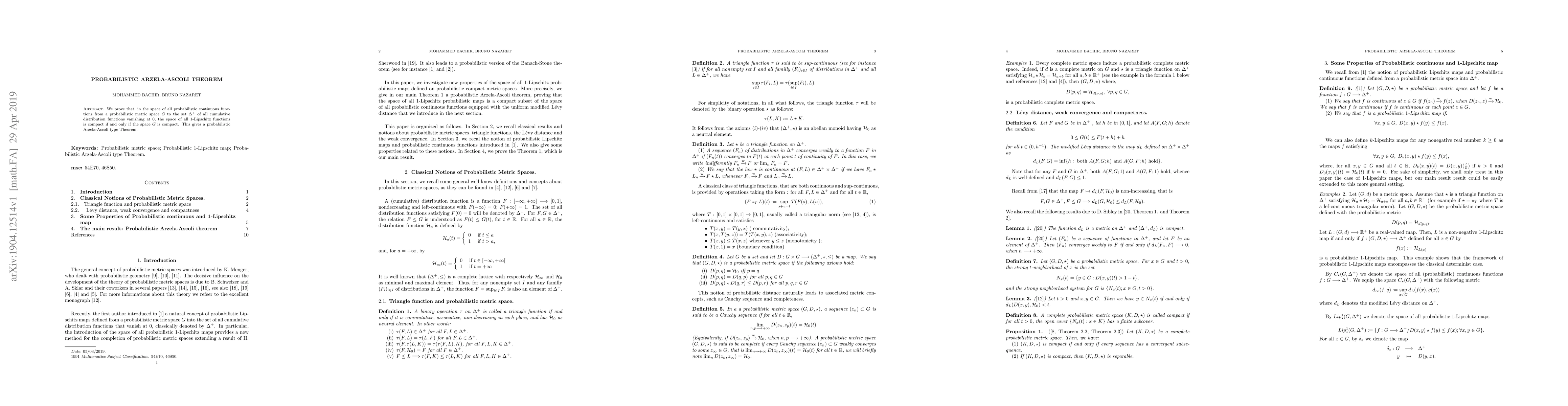 Summary: The paper proves a probabilistic version of the Arzela-Ascoli theorem, showing that the space of 1-Lipschitz functions is compact if and only if the underlying probabilistic metric space is compact. This establishes a probabilistic analogue of the classical Arzela-Ascoli theorem.