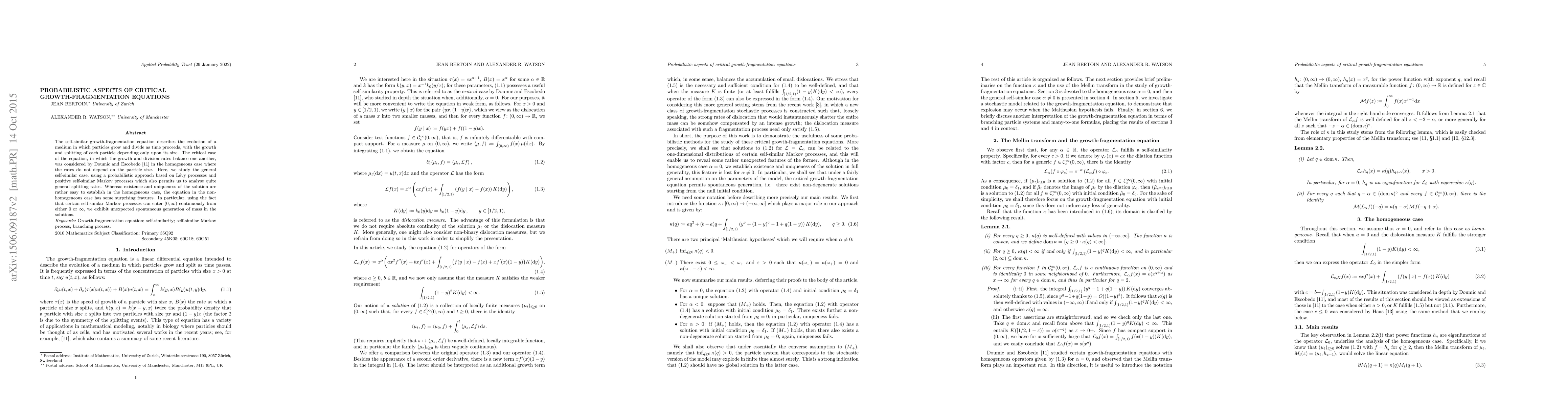 This paper investigates the critical growth-fragmentation equation using probabilistic methods based on Lévy processes, revealing unexpected spontaneous mass generation in non-homogeneous cases where growth and division rates balance. The study extends previous work on homogeneous cases to more general splitting rates.