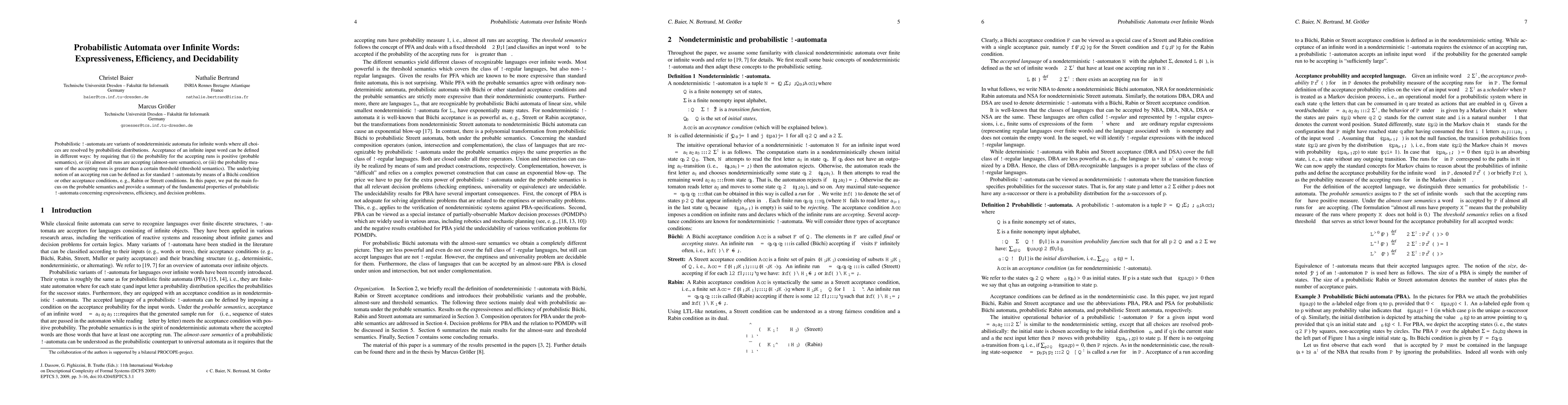 This paper investigates probabilistic omega-automata, focusing on their probable semantics, and examines their expressiveness, efficiency, and decidability. It explores various acceptance criteria for infinite input words and highlights the fundamental properties of these automata.