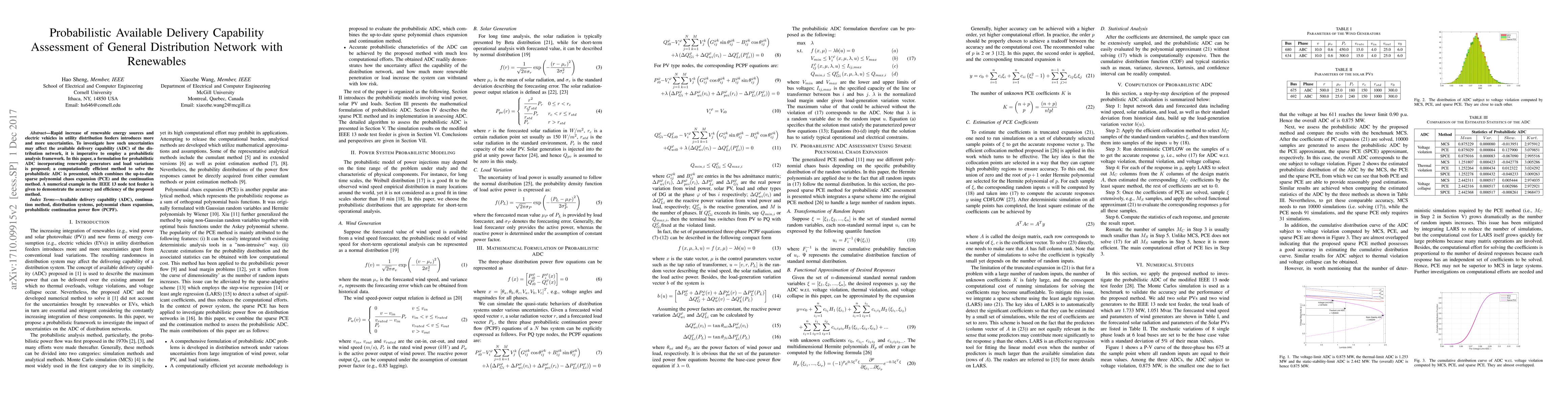 This paper proposes a probabilistic framework to assess the available delivery capability (ADC) of distribution networks with renewable energy sources and electric vehicles, incorporating generator and load uncertainties. It employs a combination of sparse polynomial chaos expansion and the continuation method for efficient computation, demonstrated through a case study on the IEEE 13 node test feeder.