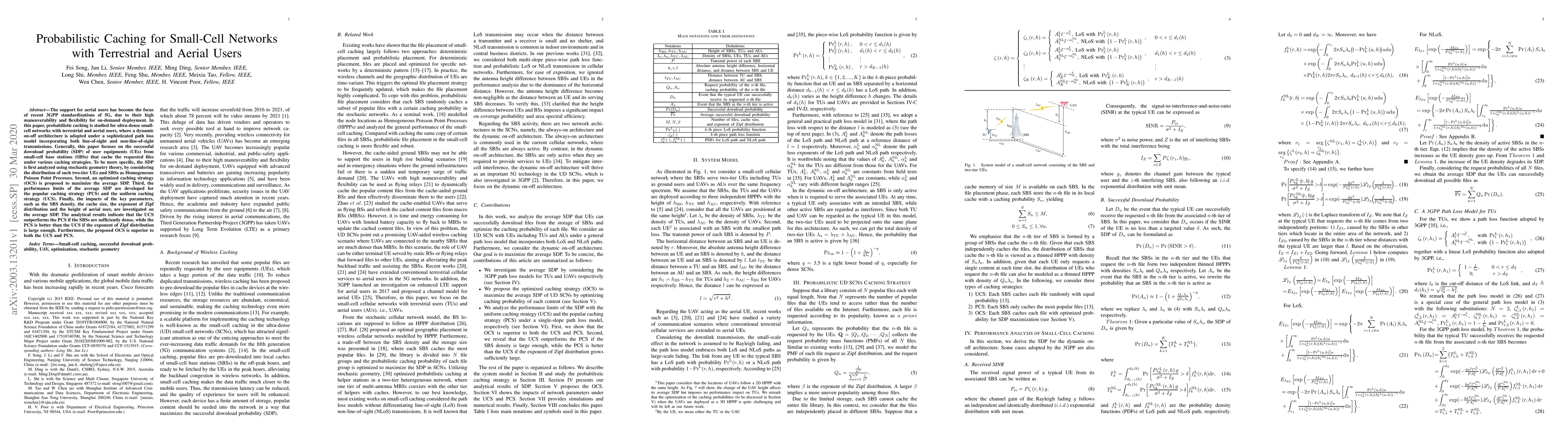 This paper investigates probabilistic caching strategies for ultra-dense small-cell networks with both terrestrial and aerial users, analyzing the successful download probability (SDP) under various caching methods. An optimized caching strategy (OCS) is proposed to maximize average SDP, and performance limits are developed for popular and uniform caching strategies, showing that OCS outperforms both under certain conditions.