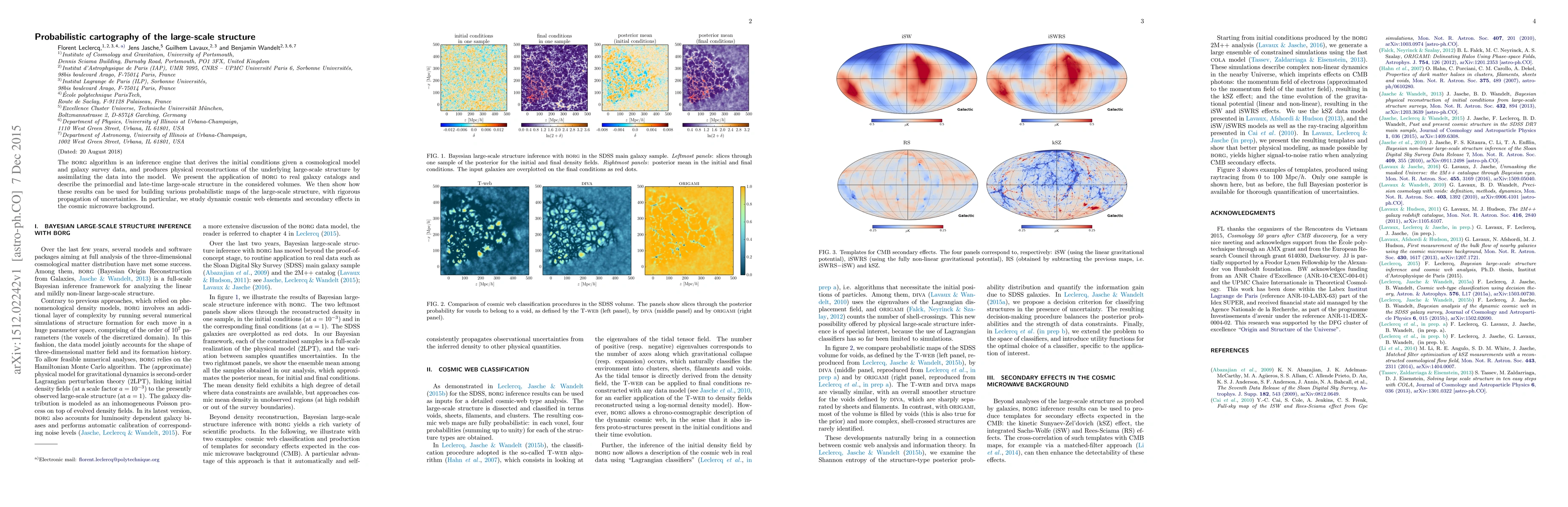 The BORG algorithm is an inference engine that derives the initial conditions given a cosmological model and galaxy survey data, and produces physical reconstructions of the underlying large-scale structure by assimilating the data into the model. We present the application of BORG to real galaxy catalogs and describe the primordial and late-time large-scale structure in the considered volumes. We then show how these results can be used for building various probabilistic maps of the large-scale structure, with rigorous propagation of uncertainties. In particular, we study dynamic cosmic web elements and secondary effects in the cosmic microwave background.