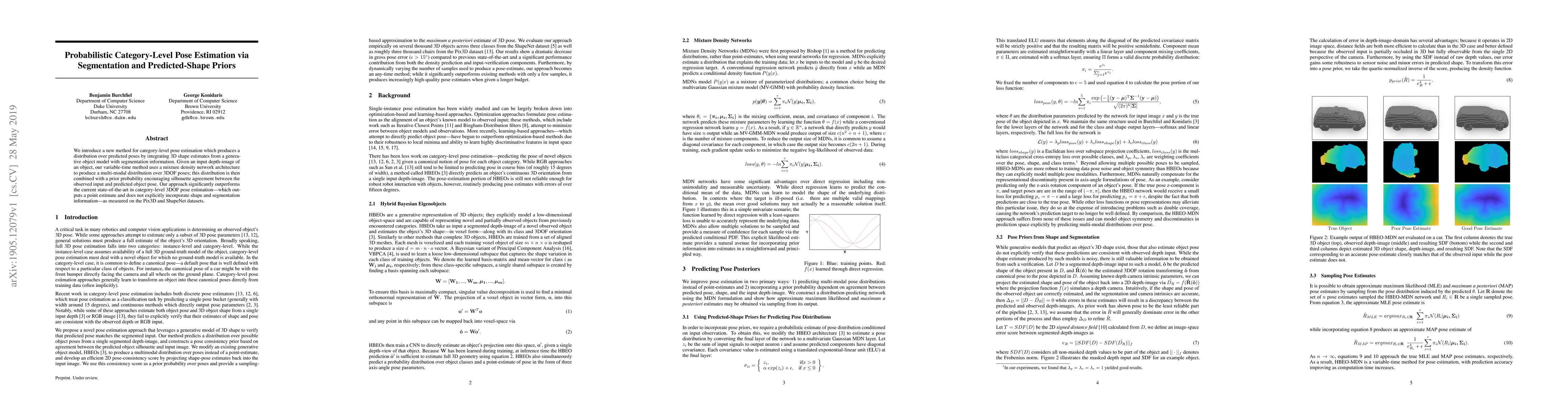 The paper presents a novel method for category-level pose estimation, integrating 3D shape estimates and segmentation data. This approach, using a mixture density network, generates a distribution over 3DOF poses, significantly outperforming current state-of-the-art methods on Pix3D and ShapeNet datasets by explicitly incorporating shape and segmentation information.