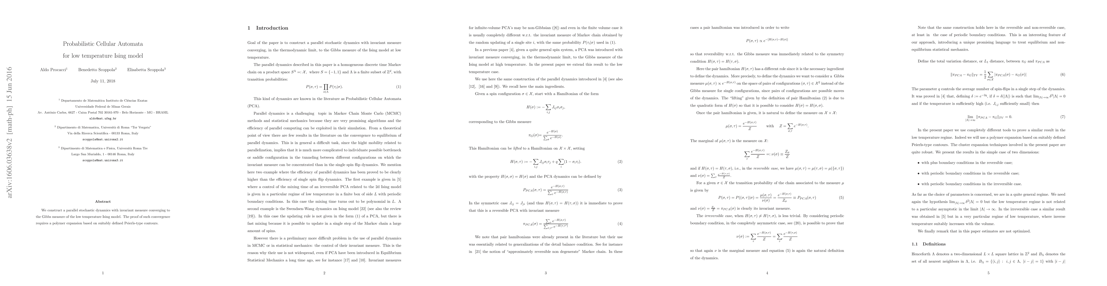 This paper develops a probabilistic cellular automaton that simulates the low temperature Ising model, demonstrating its convergence to the Gibbs measure via a polymer expansion based on Peierls-type contours. The method provides a novel stochastic dynamics for studying the Ising model.