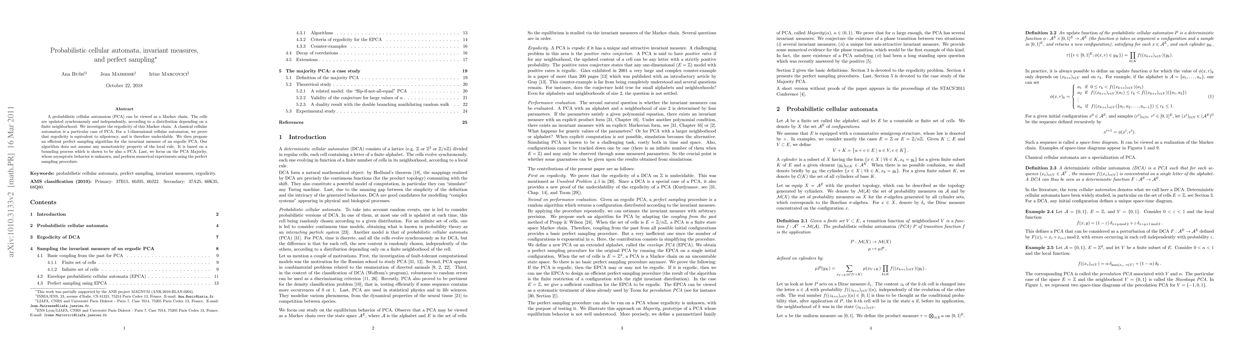 A probabilistic cellular automaton (PCA) can be viewed as a Markov chain. The cells are updated synchronously and independently, according to a distribution depending on a finite neighborhood. We investigate the ergodicity of this Markov chain. A classical cellular automaton is a particular case of PCA. For a 1-dimensional cellular automaton, we prove that ergodicity is equivalent to nilpotency, and is therefore undecidable. We then propose an efficient perfect sampling algorithm for the invariant measure of an ergodic PCA. Our algorithm does not assume any monotonicity property of the local rule. It is based on a bounding process which is shown to be also a PCA. Last, we focus on the PCA Majority, whose asymptotic behavior is unknown, and perform numerical experiments using the perfect sampling procedure.