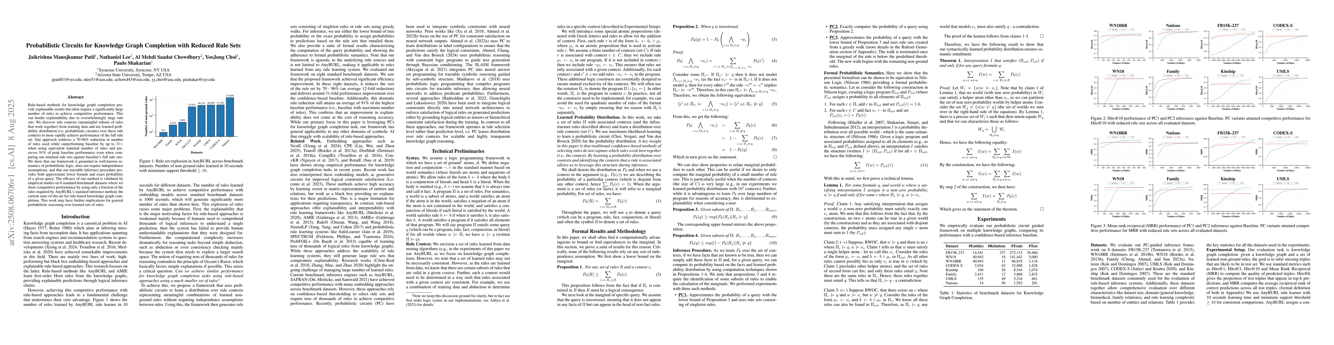 Rule-based methods for knowledge graph completion provide explainable results but often require a significantly large number of rules to achieve competitive performance. This can hinder explainability due to overwhelmingly large rule sets. We discover rule contexts (meaningful subsets of rules that work together) from training data and use learned probability distribution (i.e. probabilistic circuits) over these rule contexts to more rapidly achieve performance of the full rule set. Our approach achieves a 70-96% reduction in number of rules used while outperforming baseline by up to 31$\times$ when using equivalent minimal number of rules and preserves 91% of peak baseline performance even when comparing our minimal rule sets against baseline's full rule sets. We show that our framework is grounded in well-known semantics of probabilistic logic, does not require independence assumptions, and that our tractable inference procedure provides both approximate lower bounds and exact probability of a given query. The efficacy of our method is validated by empirical studies on 8 standard benchmark datasets where we show competitive performance by using only a fraction of the rules required by AnyBURL's standard inference method, the current state-of-the-art for rule-based knowledge graph completion. This work may have further implications for general probabilistic reasoning over learned sets of rules.