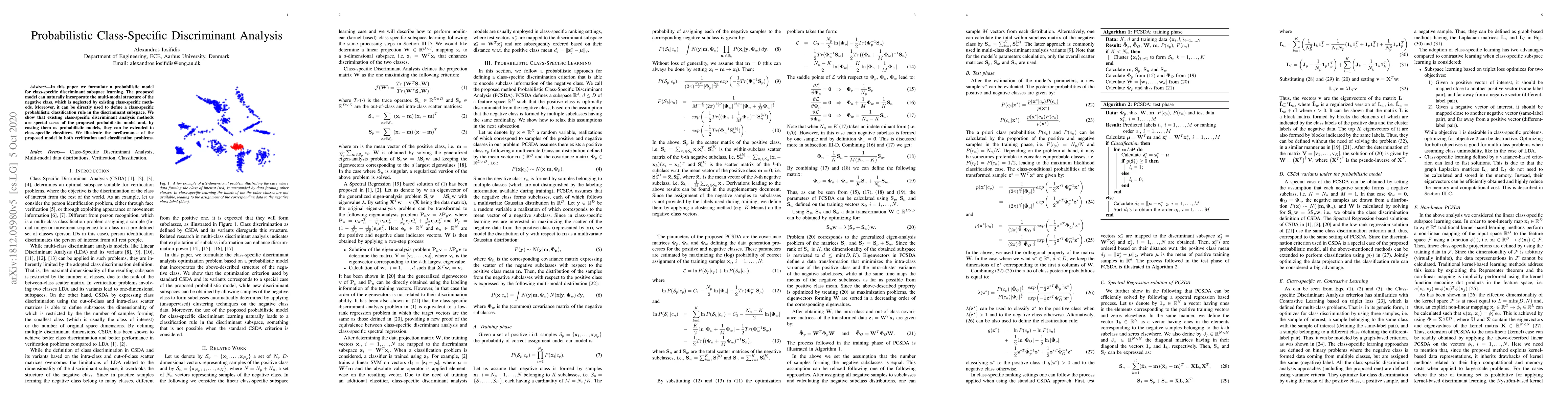 This paper introduces a probabilistic model for class-specific discriminant analysis that accounts for the multi-modal structure of the negative class, extending existing methods. It also defines a class-specific probabilistic classification rule and demonstrates its performance in verification and classification tasks.