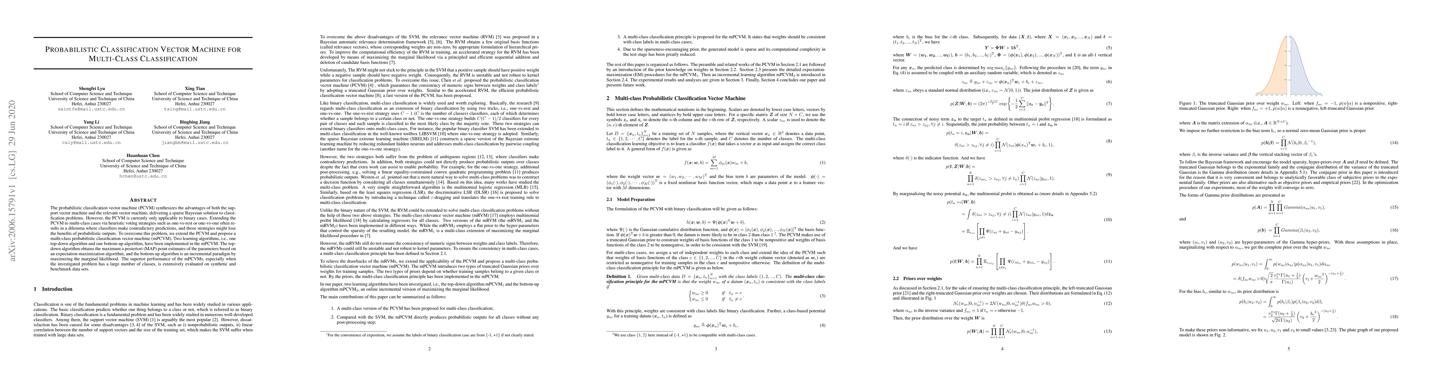 The paper proposes a multi-class probabilistic classification vector machine (mPCVM) to extend the binary PCVM, addressing the issue of contradictory predictions in heuristic multi-class extensions. It introduces two learning algorithms—a top-down MAP-based and a bottom-up incremental paradigm—and demonstrates superior performance on synthetic and benchmark datasets.