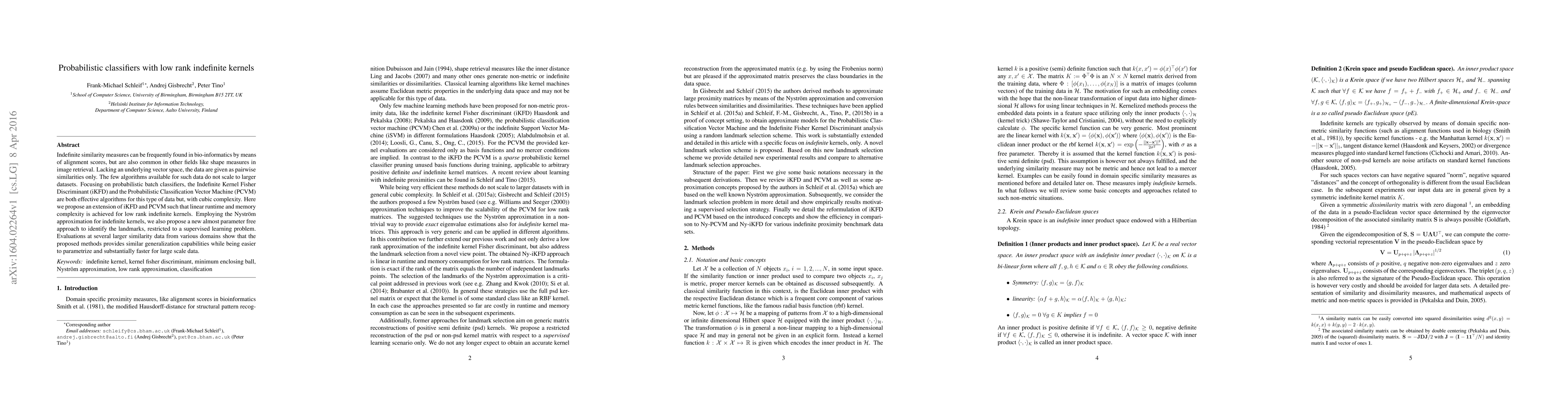New algorithms have been proposed for probabilistic classification of data with low-rank indefinite kernels, achieving linear runtime and memory complexity while maintaining similar generalization capabilities as existing methods.