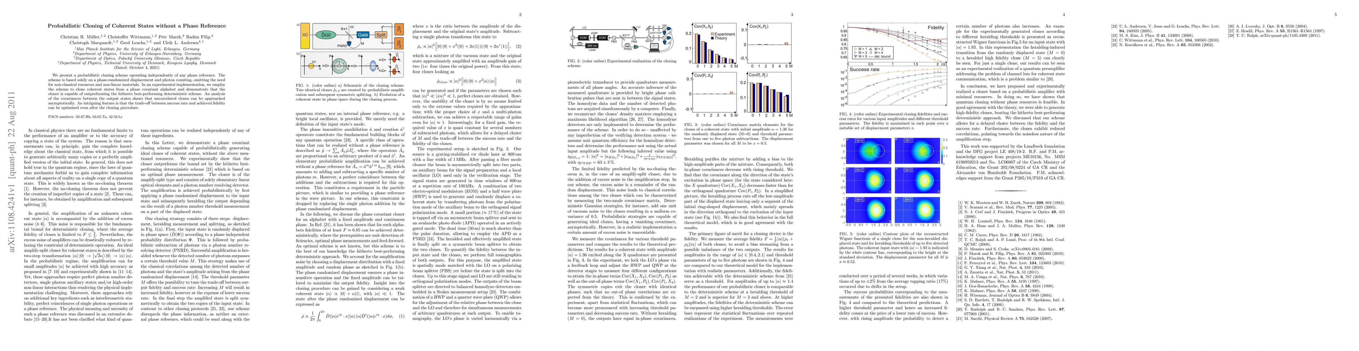 We present a probabilistic cloning scheme operating independently of any phase reference. The scheme is based solely on a phase-randomized displacement and photon counting, omitting the need for non-classical resources and non-linear materials. In an experimental implementation, we employ the scheme to clone coherent states from a phase covariant alphabet and demonstrate that the cloner is capable of outperforming the hitherto best-performing deterministic scheme. An analysis of the covariances between the output states shows that uncorrelated clones can be approached asymptotically. An intriguing feature is that the trade-off between success rate and achieved fidelity can be optimized even after the cloning procedure.