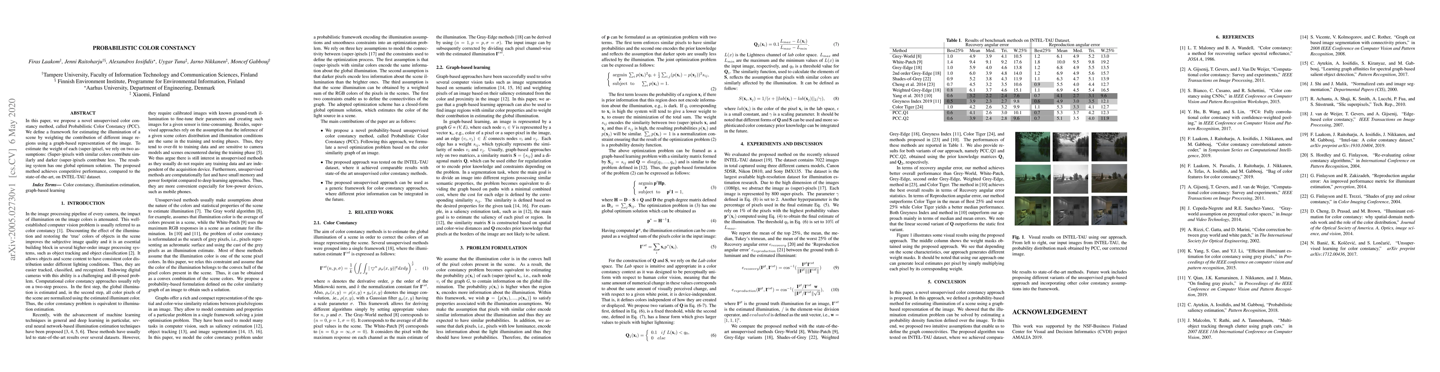 This paper introduces Probabilistic Color Constancy (PCC), an unsupervised method for estimating scene illumination by weighting image regions based on color similarity and brightness. The method achieves competitive results compared to state-of-the-art techniques on the INTEL-TAU dataset.