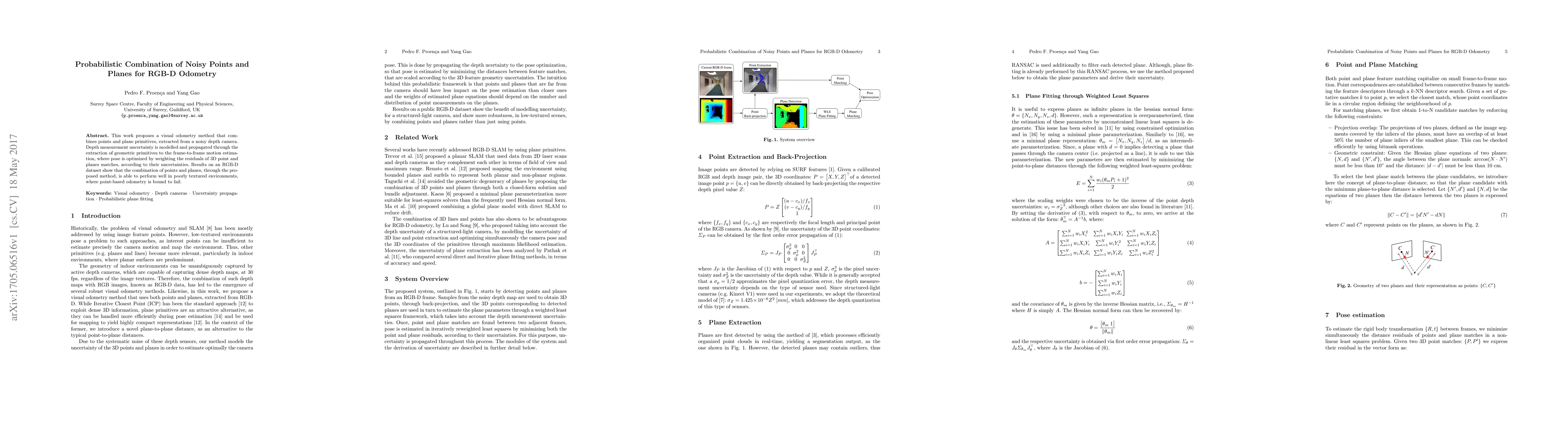 This paper introduces a probabilistic visual odometry method that integrates noisy points and plane primitives from depth camera data for improved motion estimation. The method optimizes pose by weighting the uncertainties of 3D point and plane matches, demonstrating superior performance in low-texture environments compared to point-based odometry.