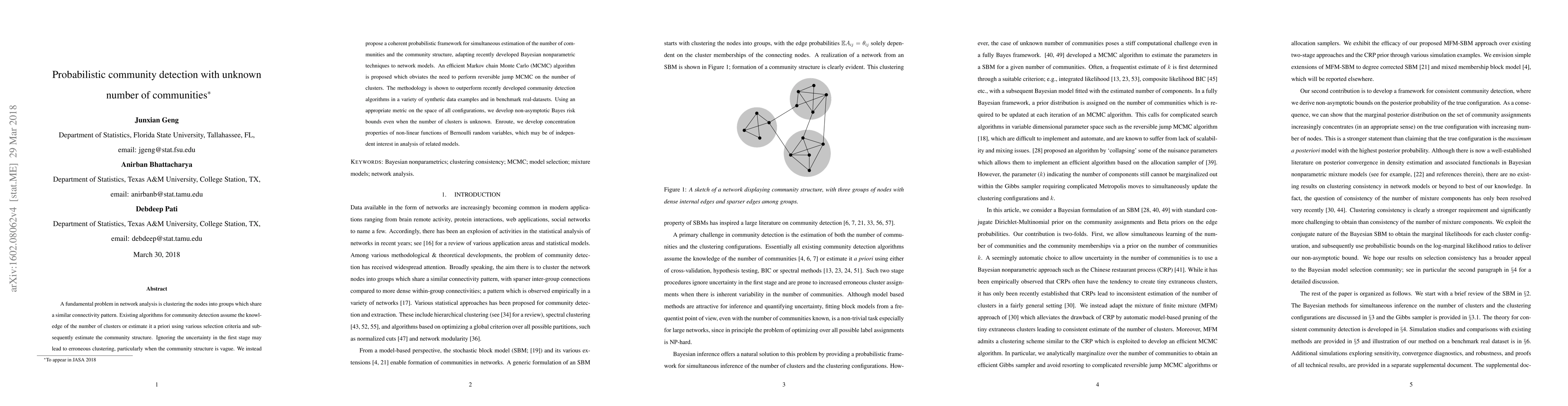 This paper proposes a probabilistic framework for community detection in networks without prior knowledge of the number of communities, utilizing Bayesian nonparametric techniques and an efficient MCMC algorithm. The method outperforms existing algorithms and provides non-asymptotic Bayes risk bounds, even when the number of communities is unknown.