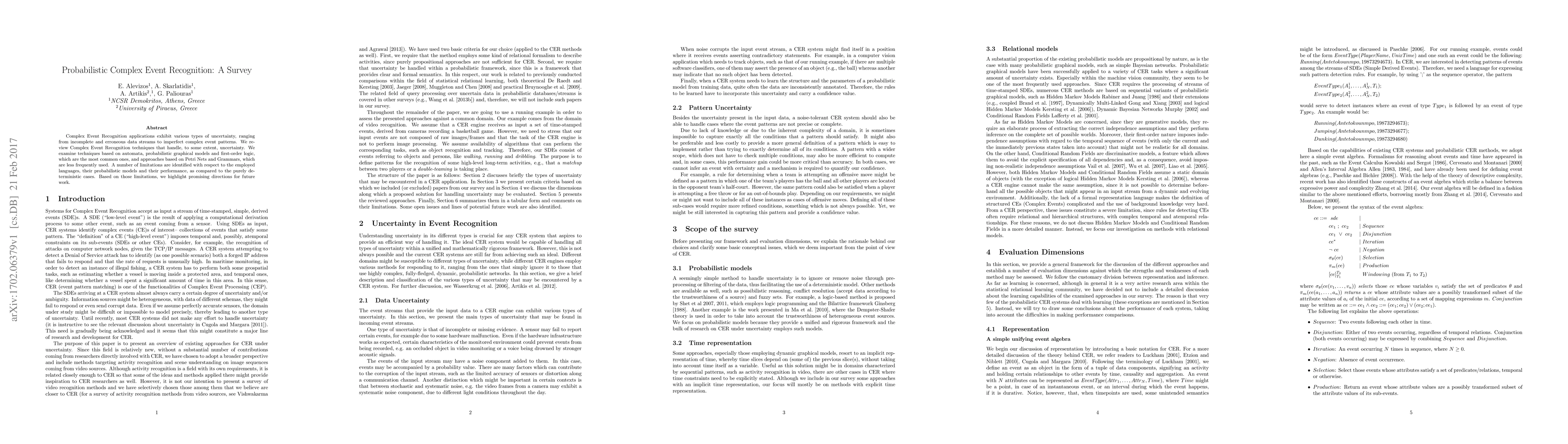 This paper surveys techniques for Probabilistic Complex Event Recognition, focusing on methods that address uncertainty in data streams and event patterns. It reviews common approaches based on automata, probabilistic models, and logic, while also noting limitations and suggesting future research directions.