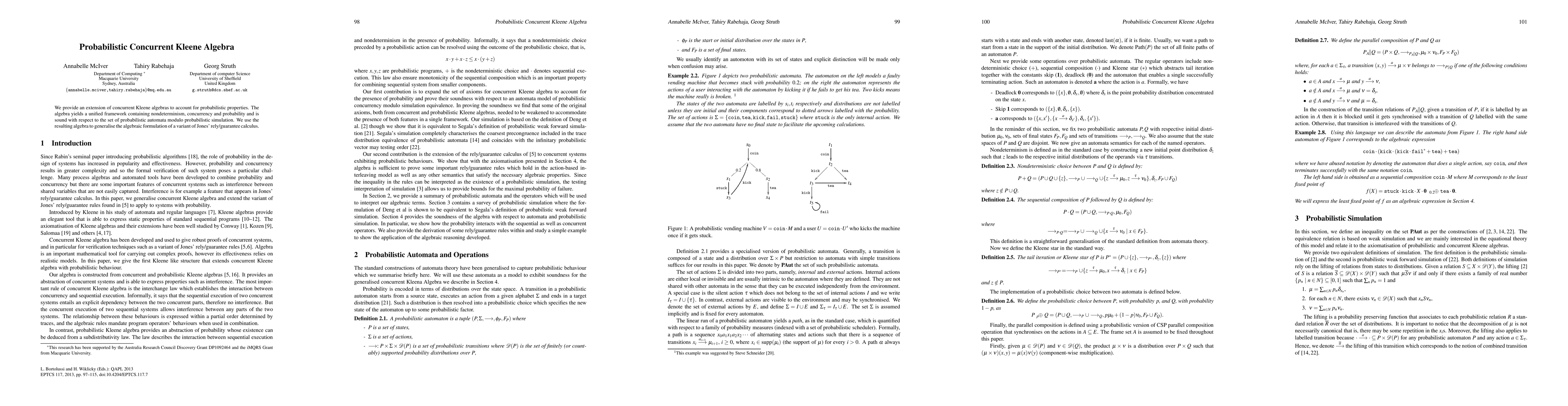 This paper extends concurrent Kleene algebras to incorporate probabilistic properties, creating a unified framework for nondeterminism, concurrency, and probability. It proves the soundness of the new algebra in relation to probabilistic automata and uses it to generalize Jones' rely/guarantee calculus.